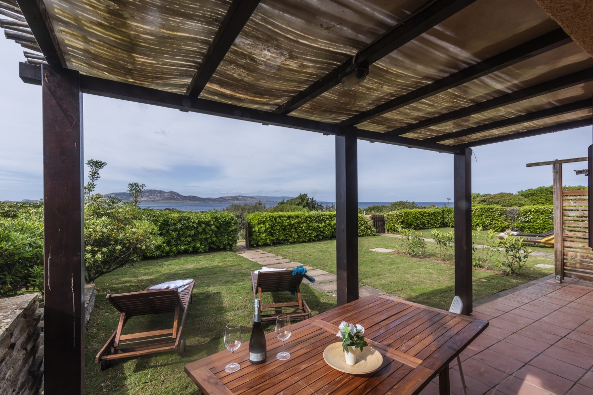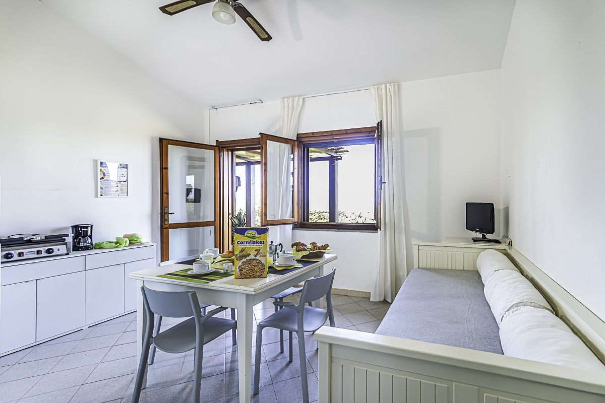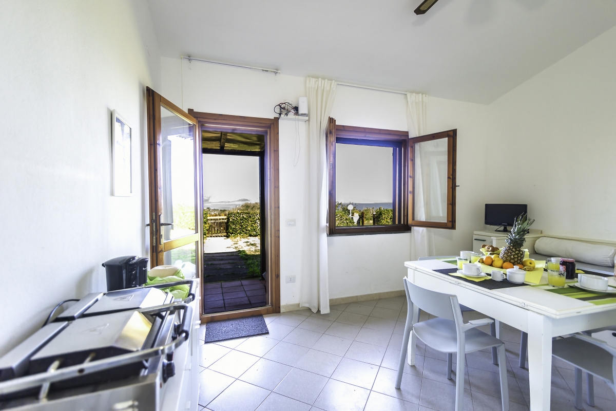 The shaded veranda at the front of the apartment looks out over the shared garden, to the Gulf of Asinara beyond. It is equipped for outdoor dining, so guests can enjoy meals al fresco, with panoramic sea views. A glass door leads from the veranda to the open-plan living room, which is furnished with a sofa, a TV and a dining table with chairs. The kitchenette is equipped with a cooker hob, oven, Mokka coffee machine and fridge/freezer.