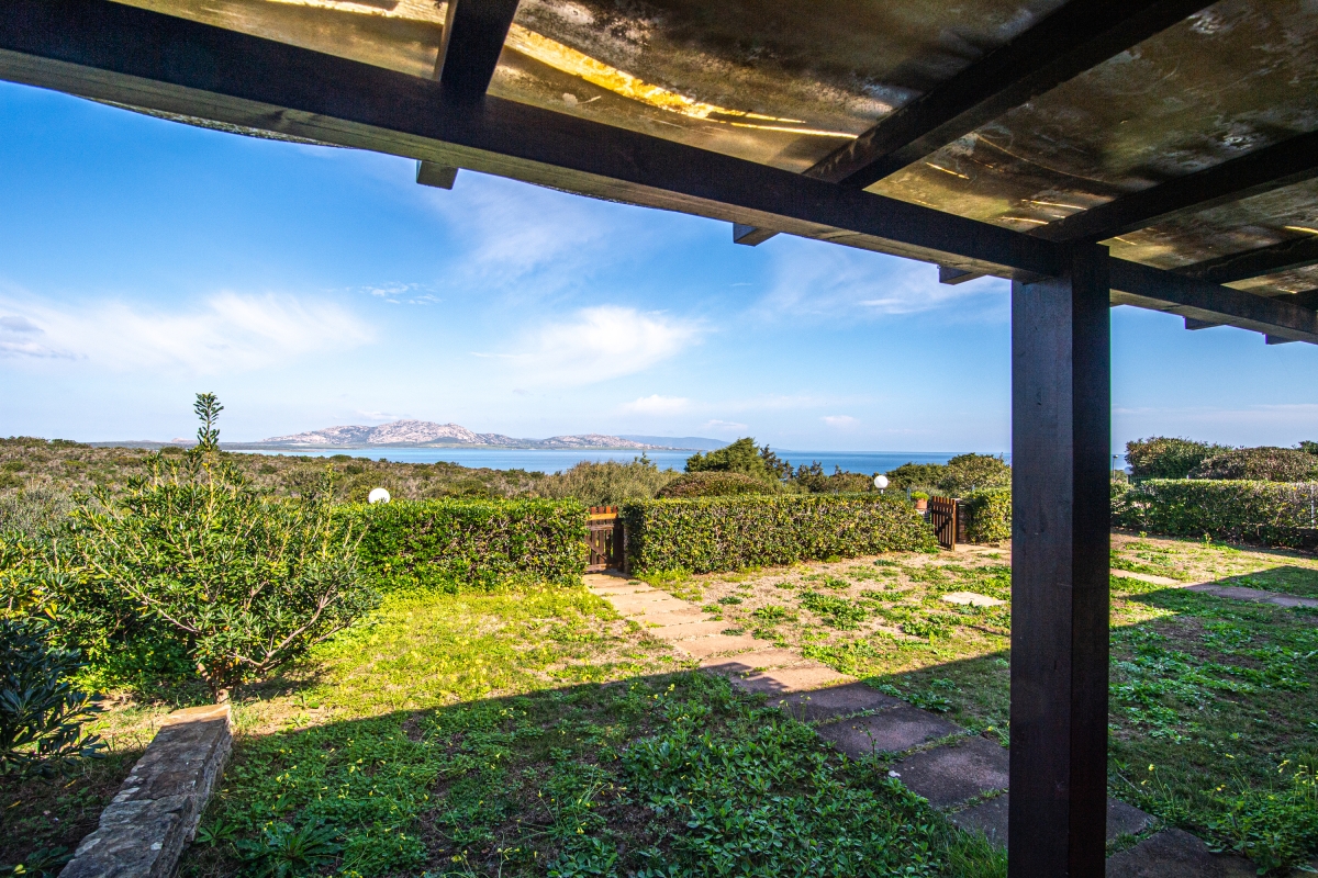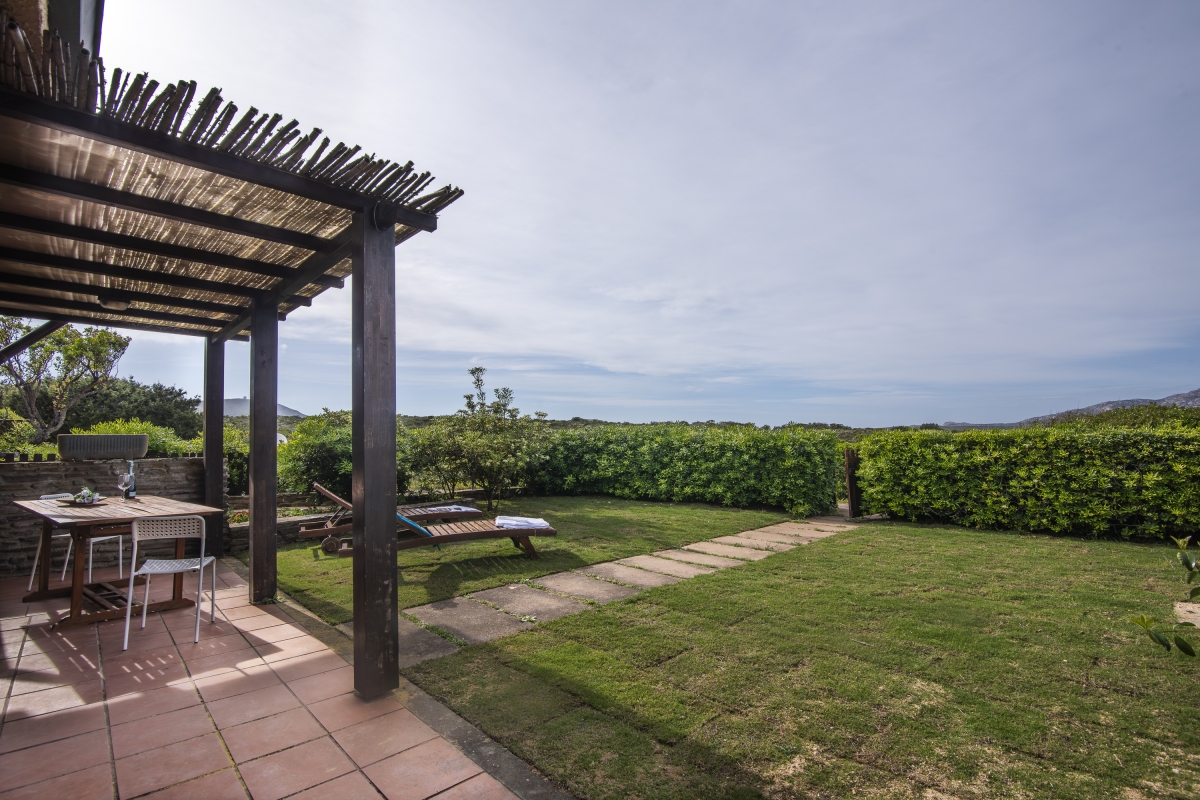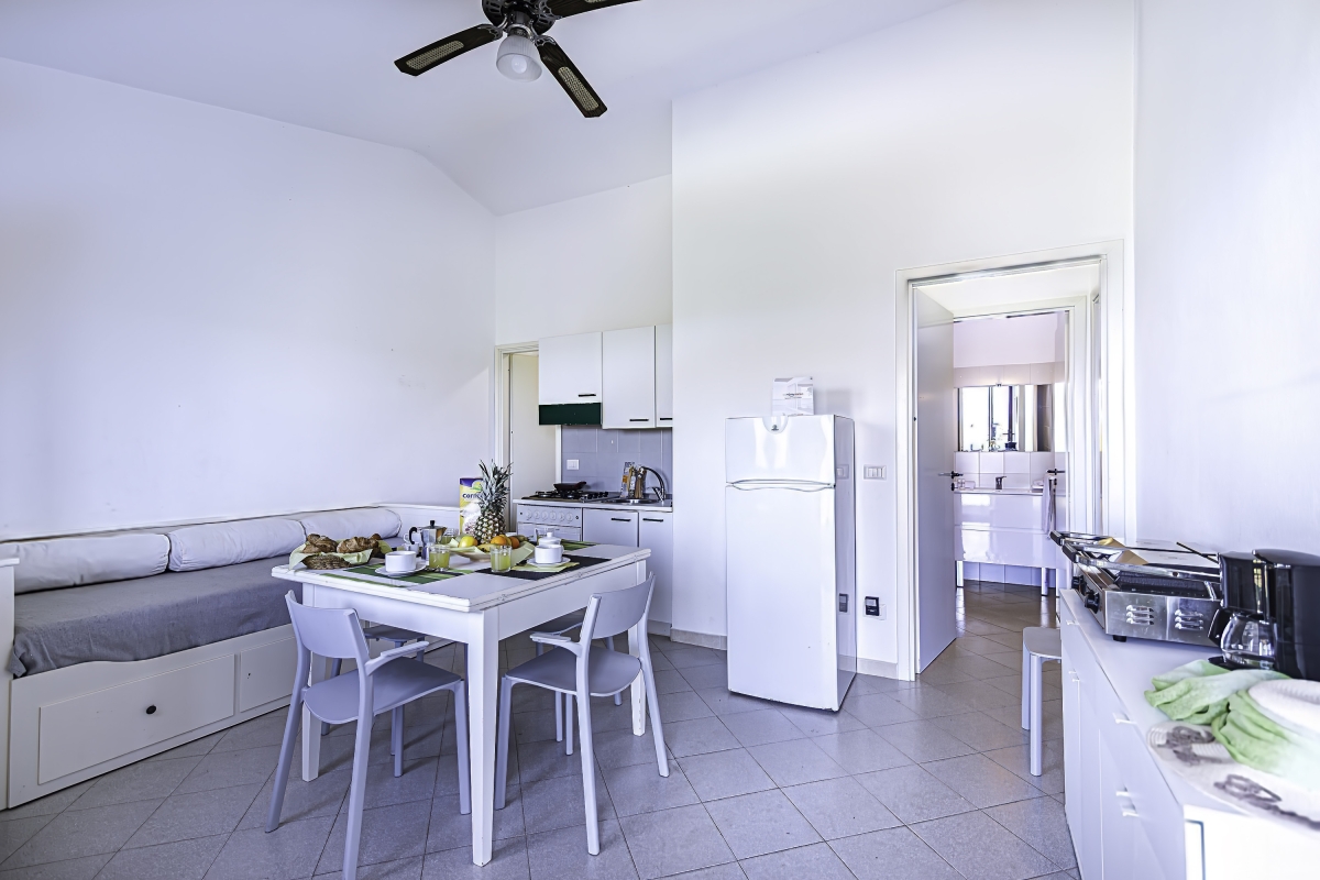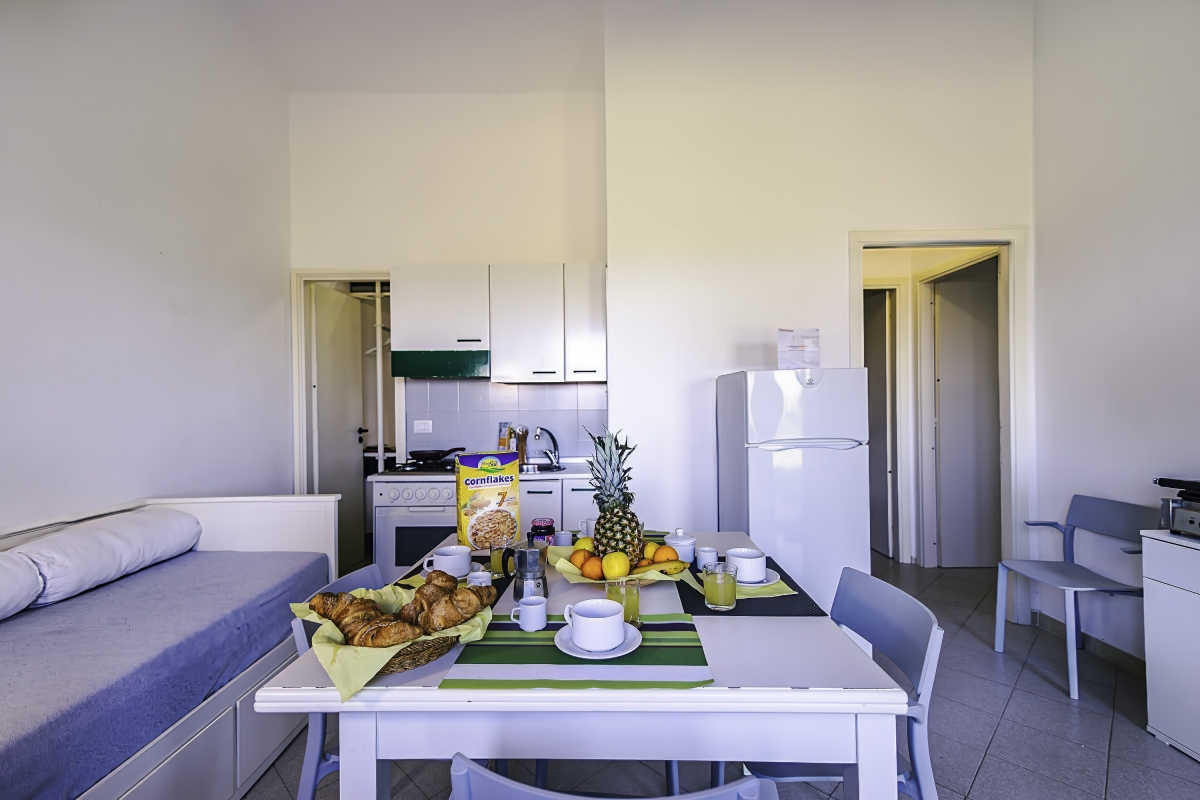 The shaded veranda at the front of the apartment looks out over the shared garden, to the Gulf of Asinara beyond. It is equipped for outdoor dining, so guests can enjoy meals al fresco, with panoramic sea views. A glass door leads from the veranda to the open-plan living room, which is furnished with a sofa, a TV and a dining table with chairs. The kitchenette is equipped with a cooker hob, oven, Mokka coffee machine and fridge/freezer.