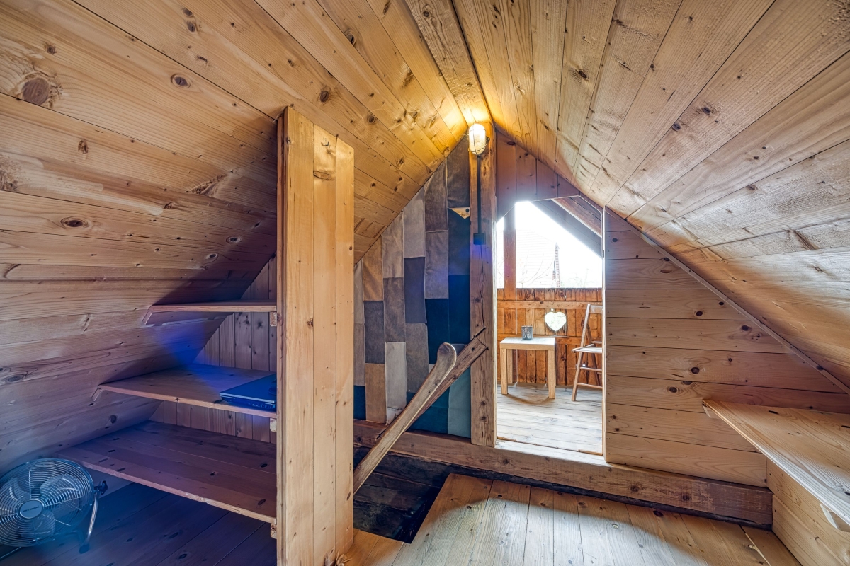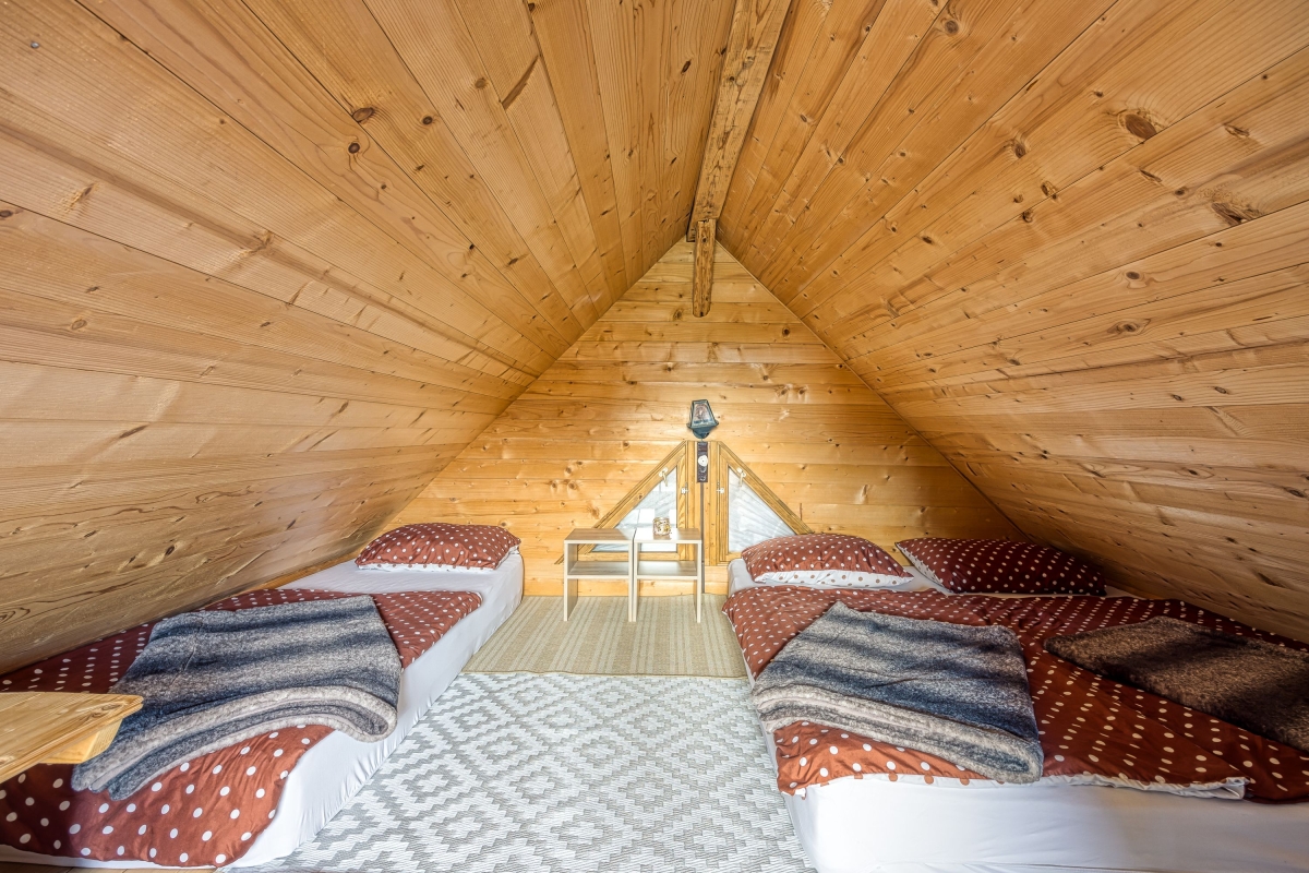 Designed in a traditional Slovenian style this wooden chalet-style cottage features well-appointed living spaces, including a cosy living room where guests can gather on chilly evenings, a kitchenette providing everything needed to prepare simple meals including; an induction hob, a fridge and a kettle. The living room is furnished with a large L-shaped sofa and a dining table.