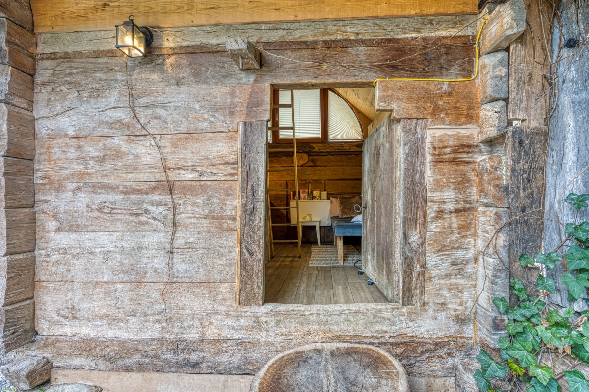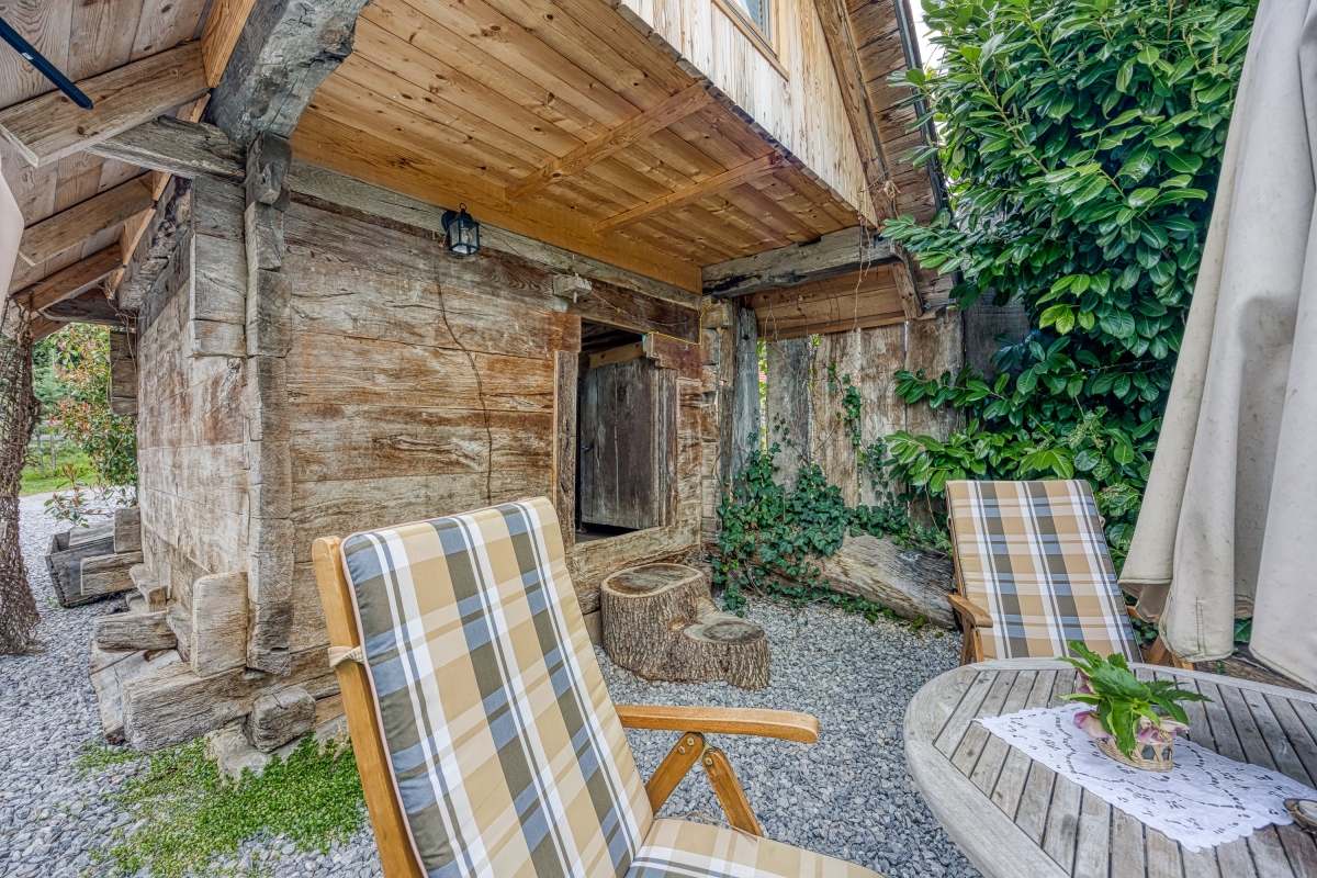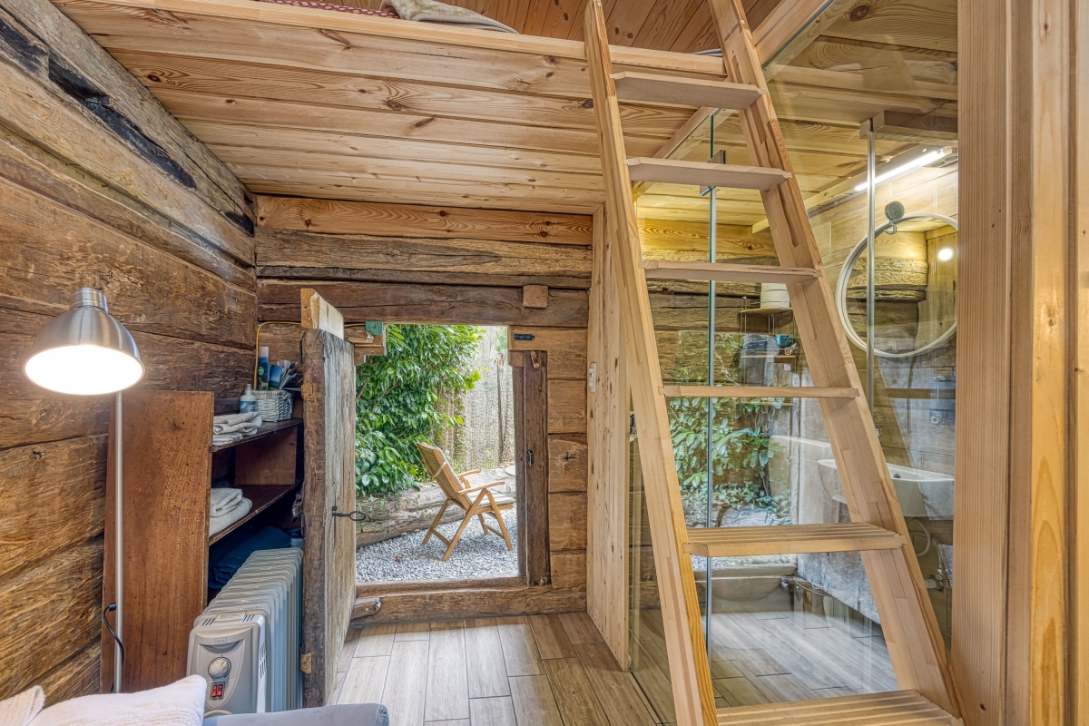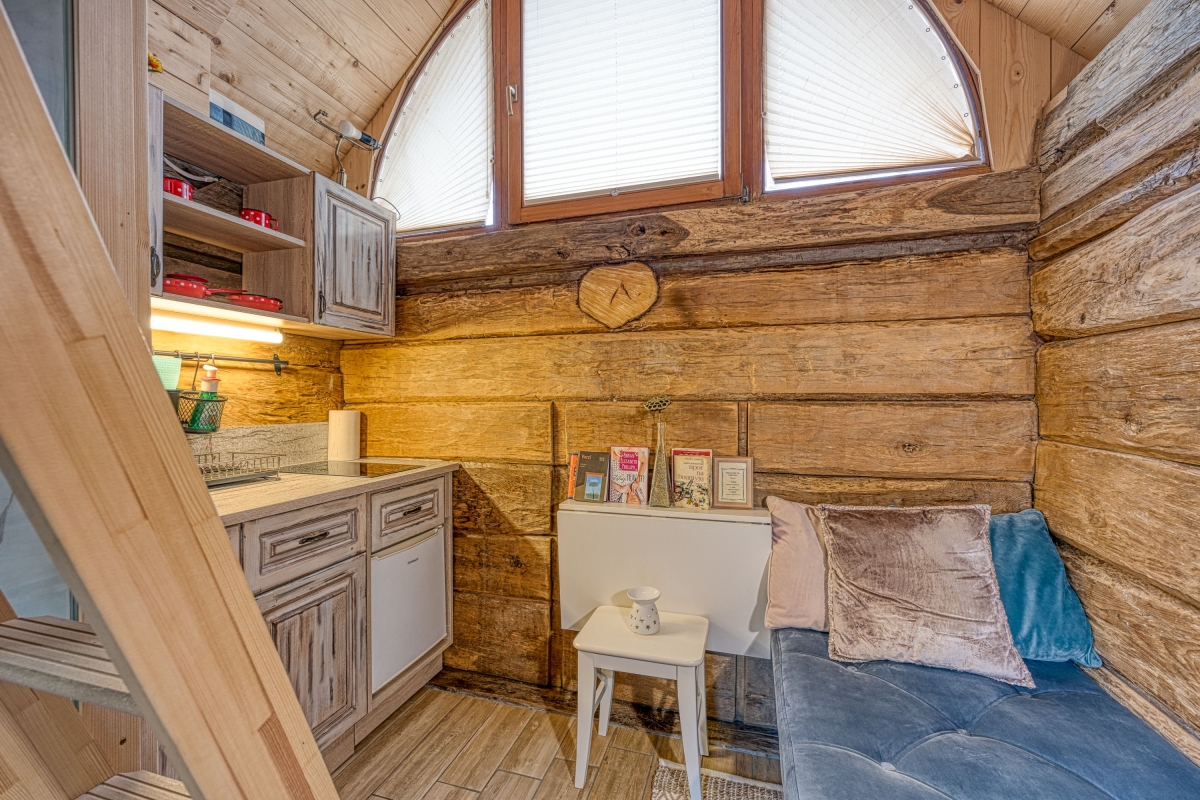 Designed in a traditional Slovenian style this charming wooden chalet-style cottage is arranged over two floors with a cosy open plan living space and bathroom on the ground floor and a small bedroom in the attic. The living space is furnished with a comfortable seating area, a small table and a kitchenette that provides everything needed to prepare a simple meal including; an induction hob, a fridge and a coffee machine.