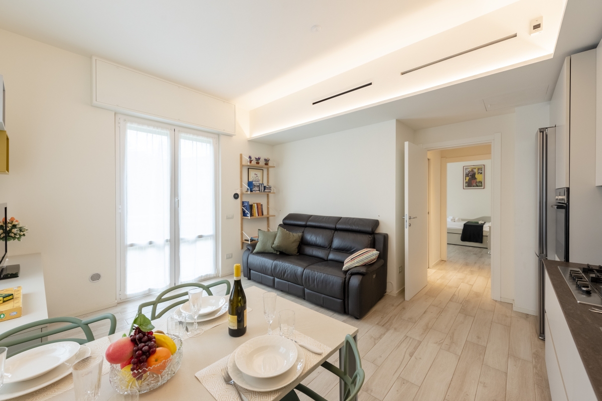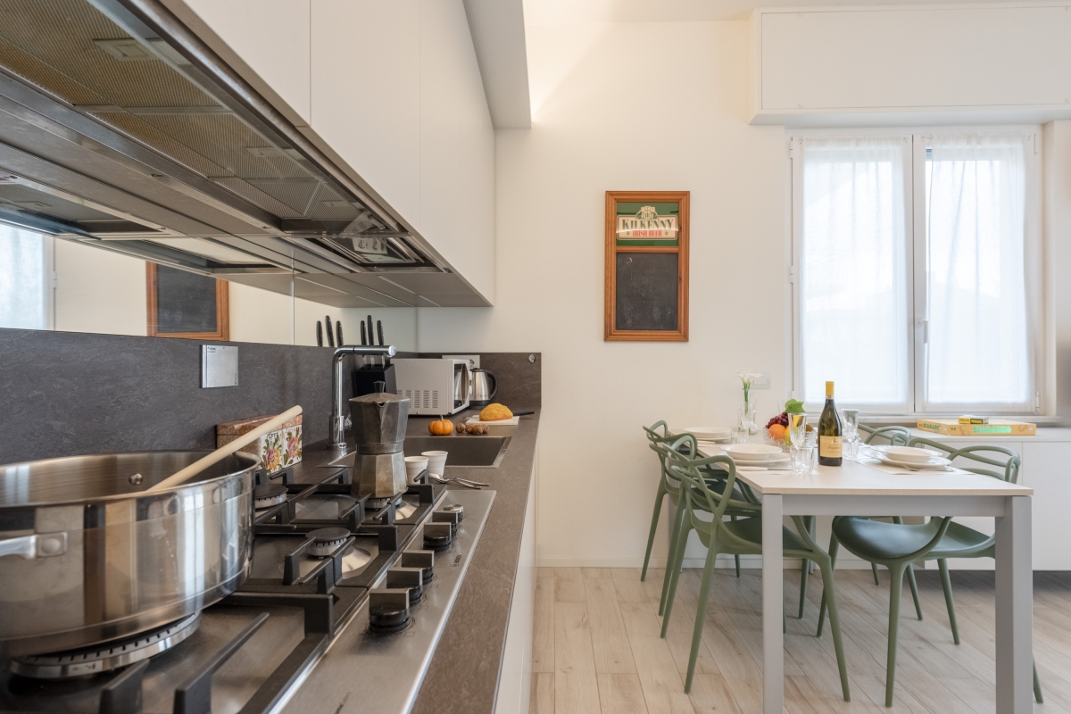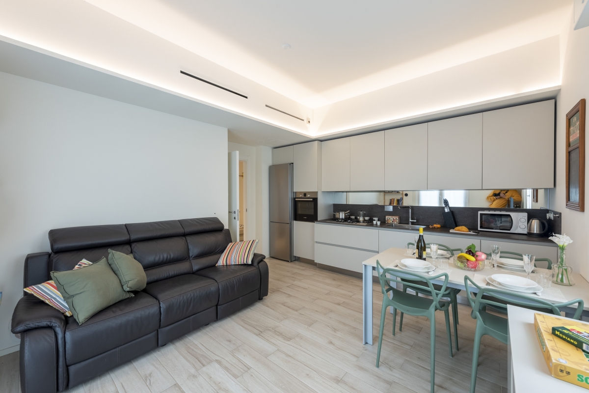 The property enjoys a stylish, open-plan living space that is furnished with a dining table and chairs, a comfortable sofa and a smart flatscreen TV. This area opens out onto a small balcony and incorporates a modern kitchen which is equipped with; a gas cooker hob, an oven, a microwave, a Mokka coffee maker and a fridge freezer.