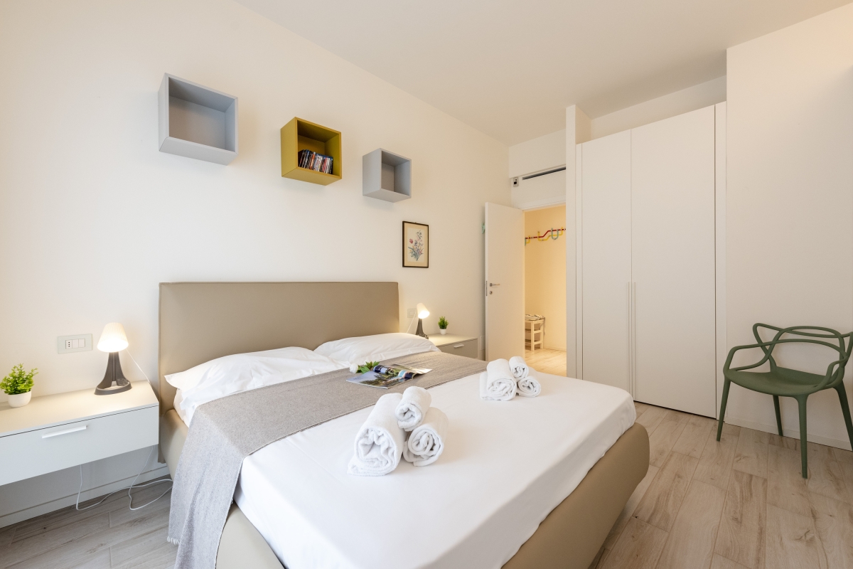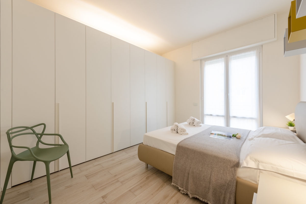 Bedroom 1: The master bedroom is furnished with a double bed and a large wardrobe