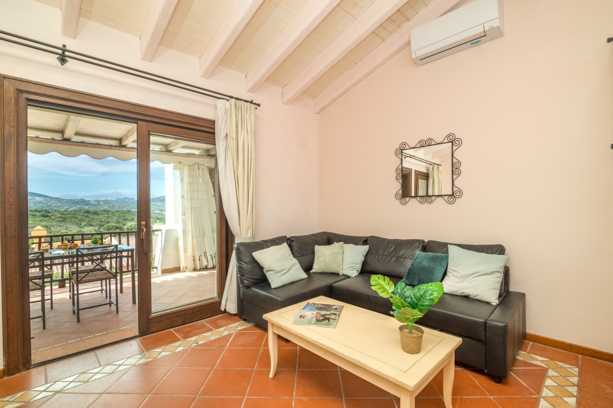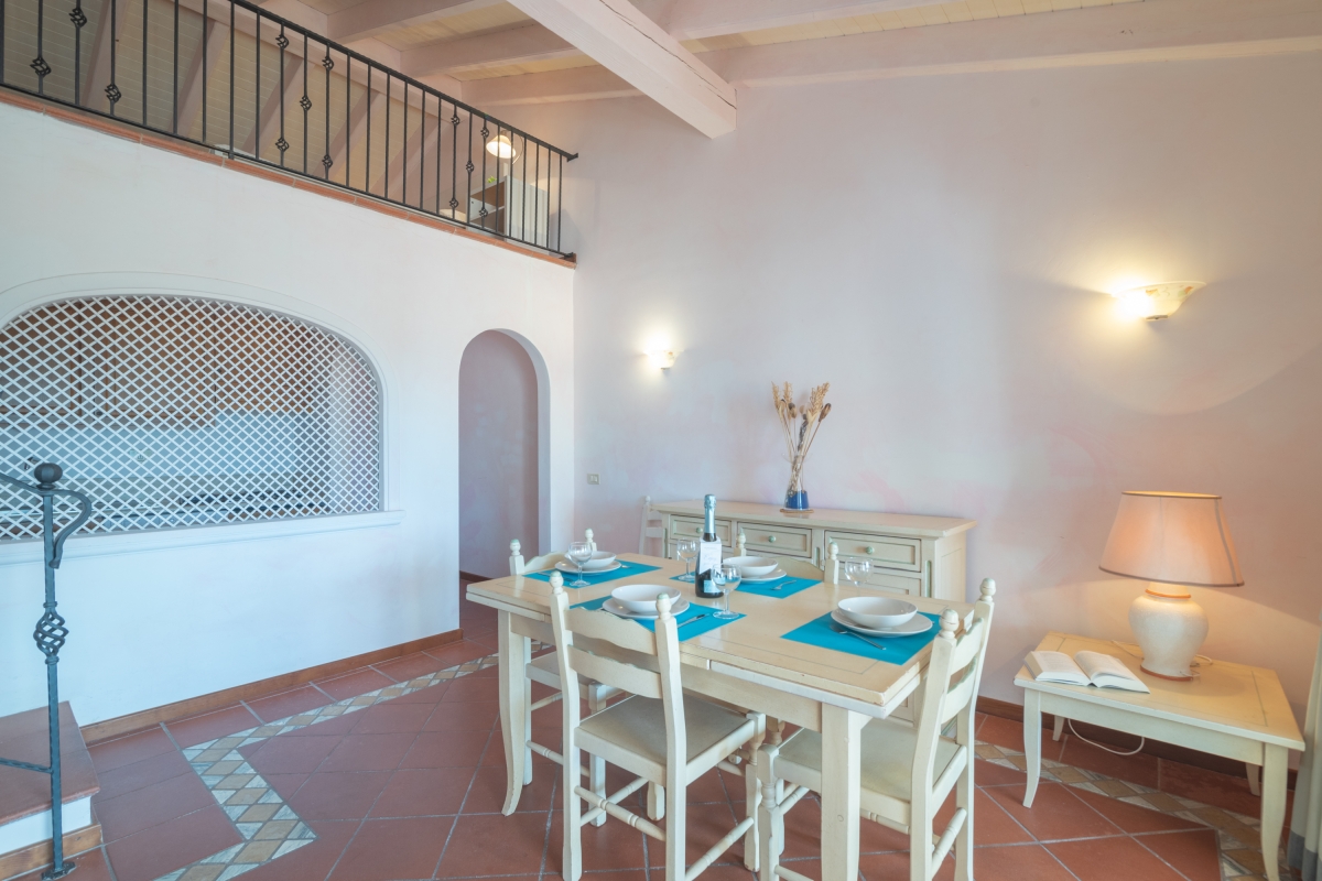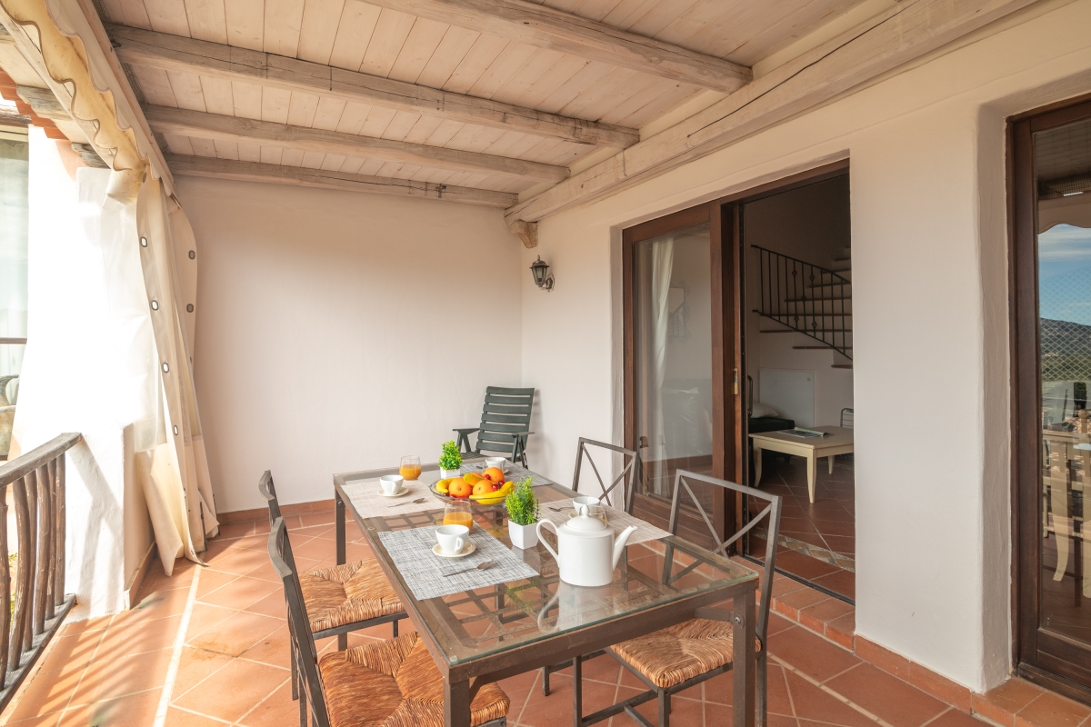The décor is rustic chic, with light wood ceilings and terracotta tiled floors. The open-plan living/dining area is furnished with an L-shaped sofa, coffee table and a pretty painted wooden dining table. Large glass doors open onto the private, shaded balcony, which is an extension of the indoor living space. On the balcony, guests can enjoy meals al fresco at the second dining table, or simply enjoy the panoramic views of the Sardinian countryside and sea.