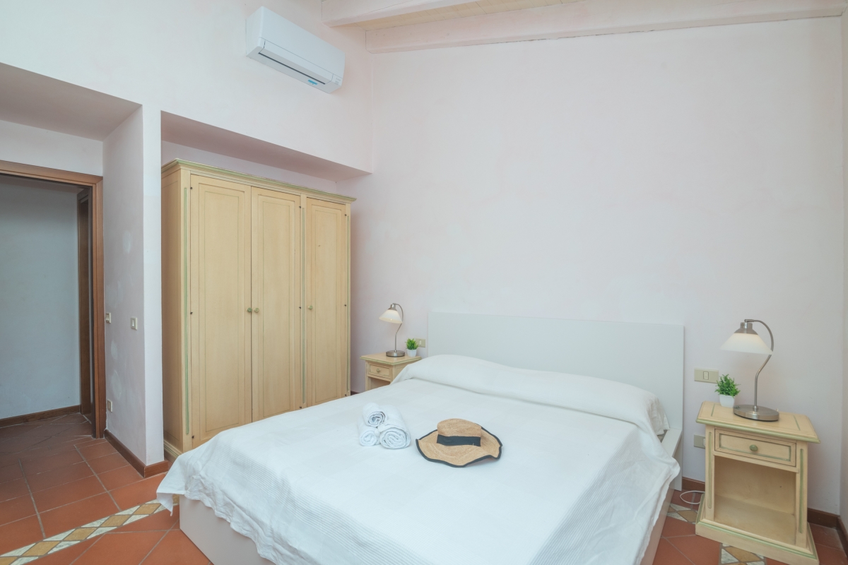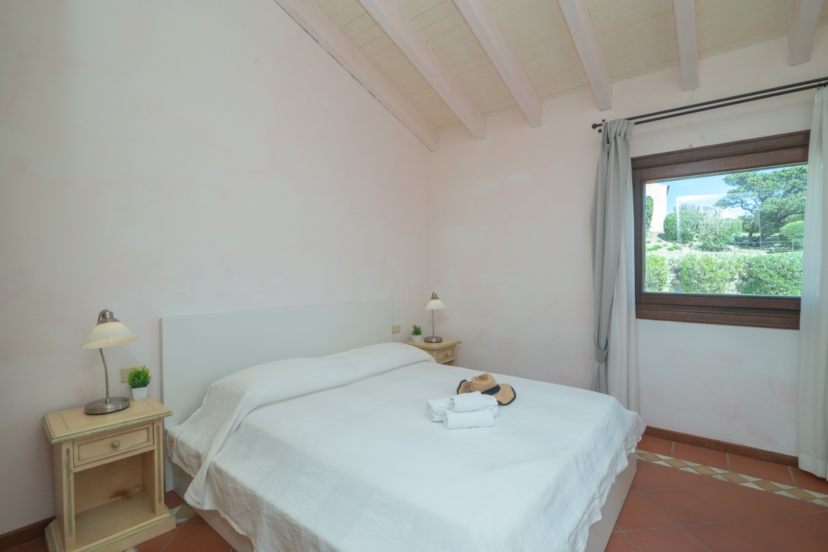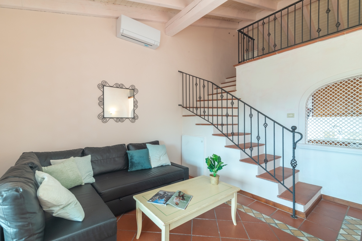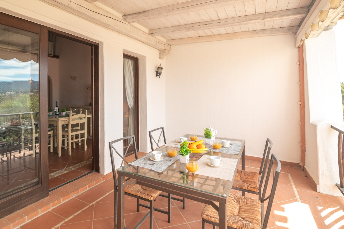 The décor is rustic chic, with light wood ceilings and terracotta tiled floors. The open-plan living/dining area is furnished with an L-shaped sofa, coffee table and a pretty painted wooden dining table. Large glass doors open onto the private, shaded balcony, which is an extension of the indoor living space. On the balcony, guests can enjoy meals al fresco at the second dining table, or simply enjoy the panoramic views of the Sardinian countryside and sea.