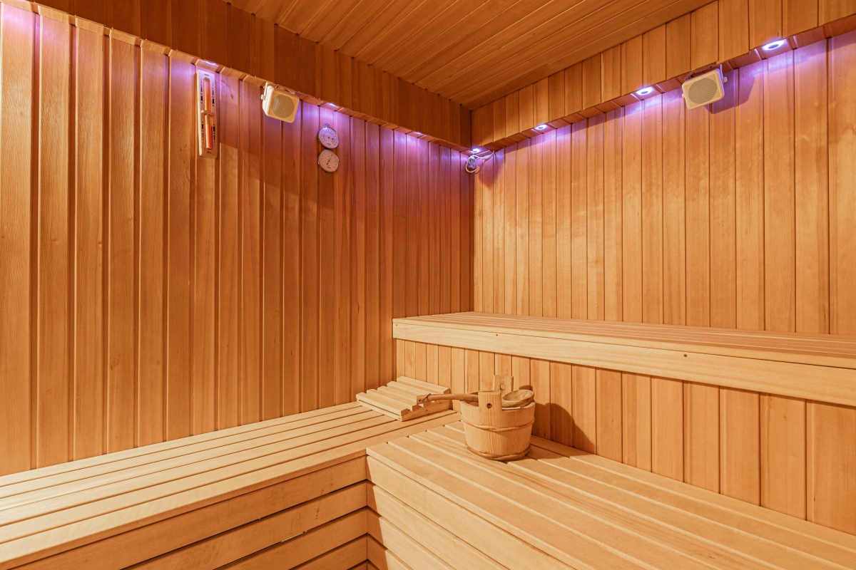 The residence has a communal sauna (which can be booked at an additional charge), a relaxation room with loungers and a large mosaic shower.