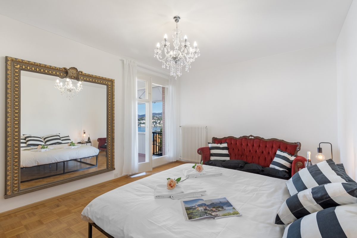 Bedroom 1: The spectacular master bedroom is furnished with a modern double bed, combined with an antique wardrobe, an elegant sofa, a large framed mirror and a balcony shared with the 2nd bedroom which looks out over the lake.