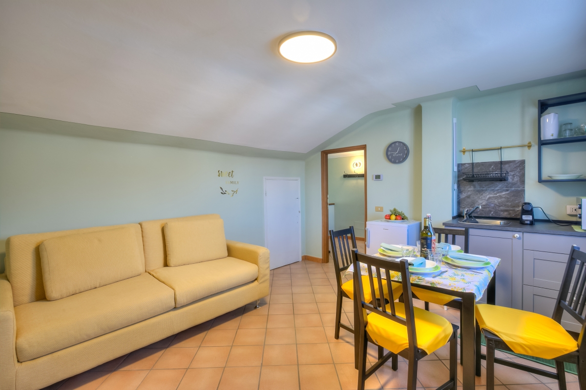 Inside, the modern one-bedroom retreat easily accommodates 3 guests. The little living room offers sun-washed, lake-view interiors to immediately transport you into the holiday mood. A comfy sofa bed of 120 cm width perfect for reading, and contemporary dining with a SMART TV. The fully modern kitchenette-dining area of the little apartment is complete with all essential kitchen utilities, including a microwave, toaster, fridge a little freezer and Nespresso coffee machine.