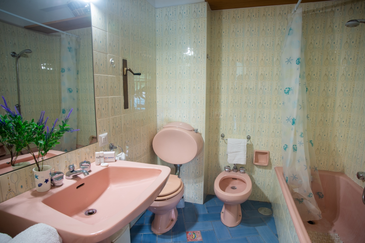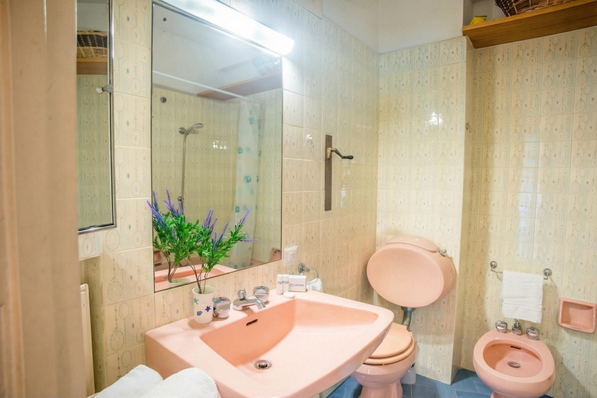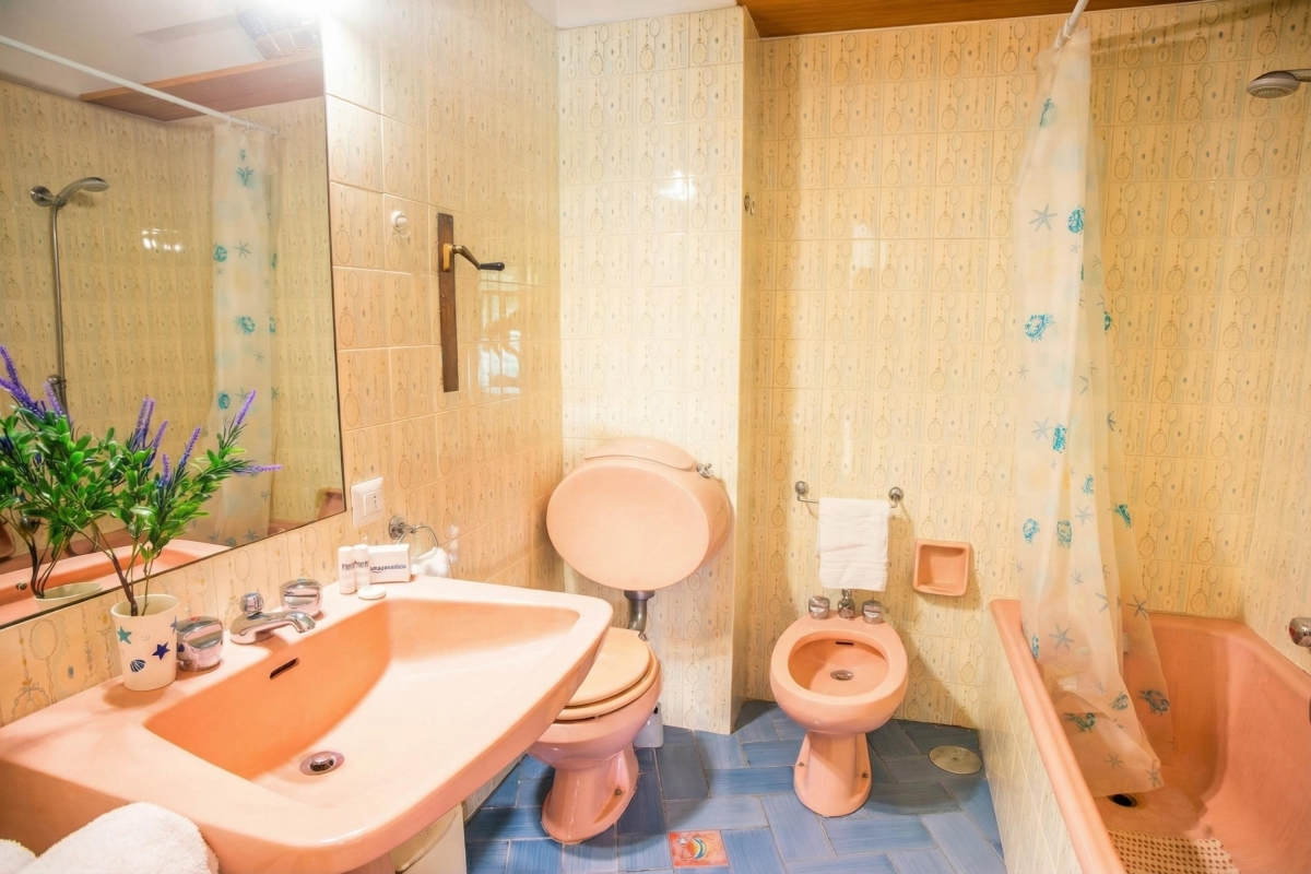 Bathroom 1: A private bathroom equipped with a bathtub with a shower, a bidet, a WC and a basin with a mirror.