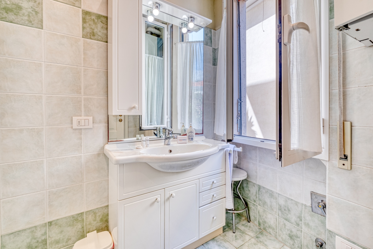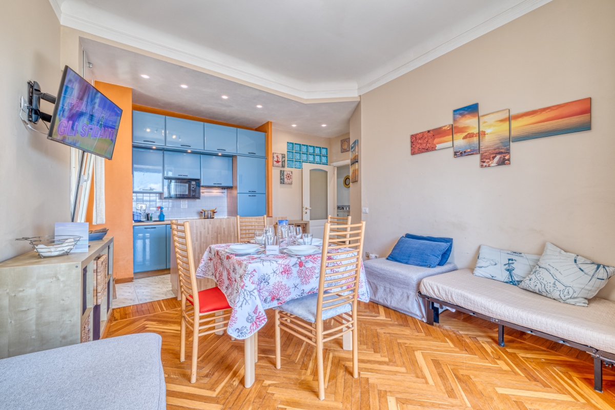 This gorgeous apartment in the quiet part of the coastal city of Sanremo is an 8-minute walk from the shores. A modern two-bedroom apartment on the first floor with a private balcony, it comfortably accommodates a group of 6. Upon entering, you will be greeted by a vibrant open-plan living room tastefully furnished with a sofa, a dining table set and a flat-screen TV. This characteristic living area seamlessly transitions into a well-equipped kitchen with an induction hob, a coffee machine, a microwave, a dishwasher and a fridge with a freezer.