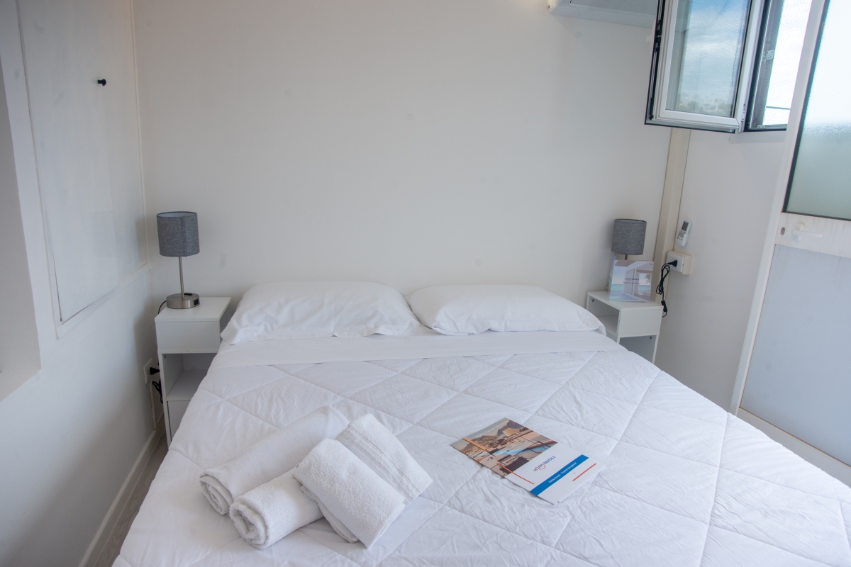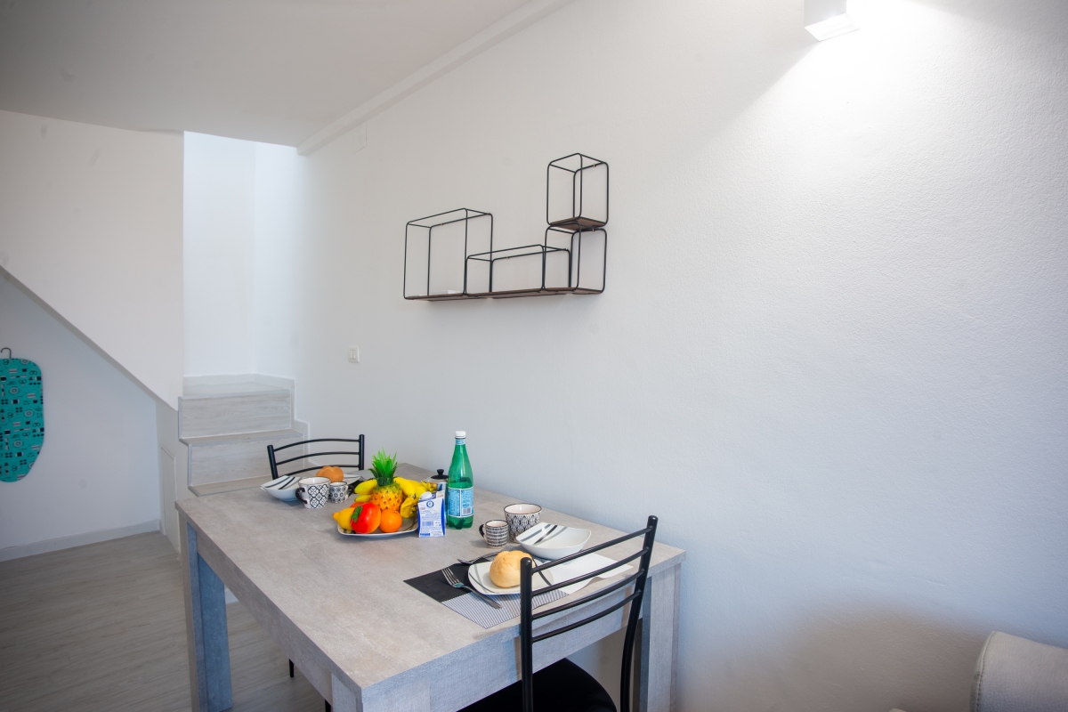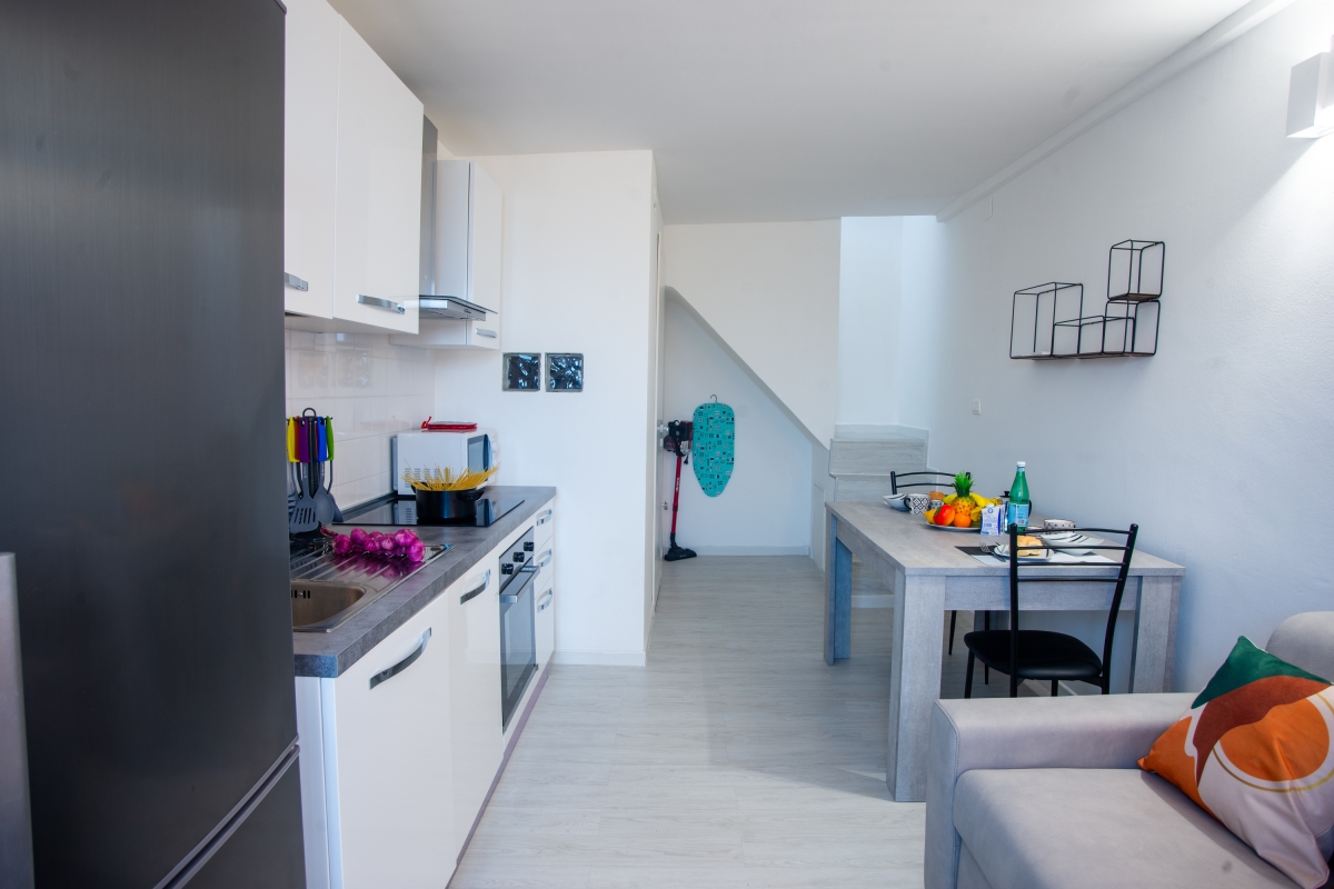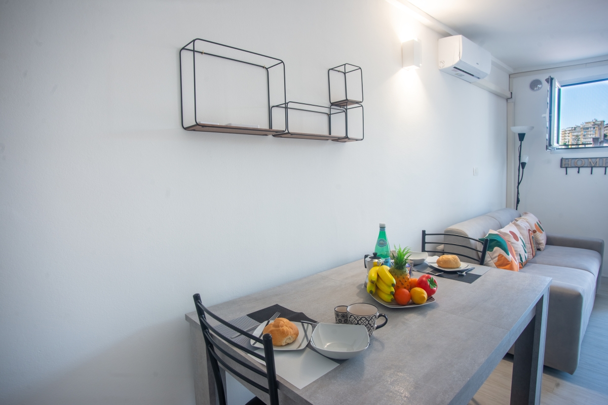 A modern apartment located near the historic centre of Sanremo, it enjoys proximity to numerous historical attractions. Situated on the first floor, this one-bedroom apartment features a private balcony and is perfect for 2. It is a charming apartment with contemporary décor featuring an open-plan living room tastefully furnished with a sofa, a floor lamp and a dining table with chairs. This living area effortlessly transitions into a fully equipped modern kitchen with an induction hob, a coffee machine, an electric kettle, a microwave, an oven and a fridge with a freezer.