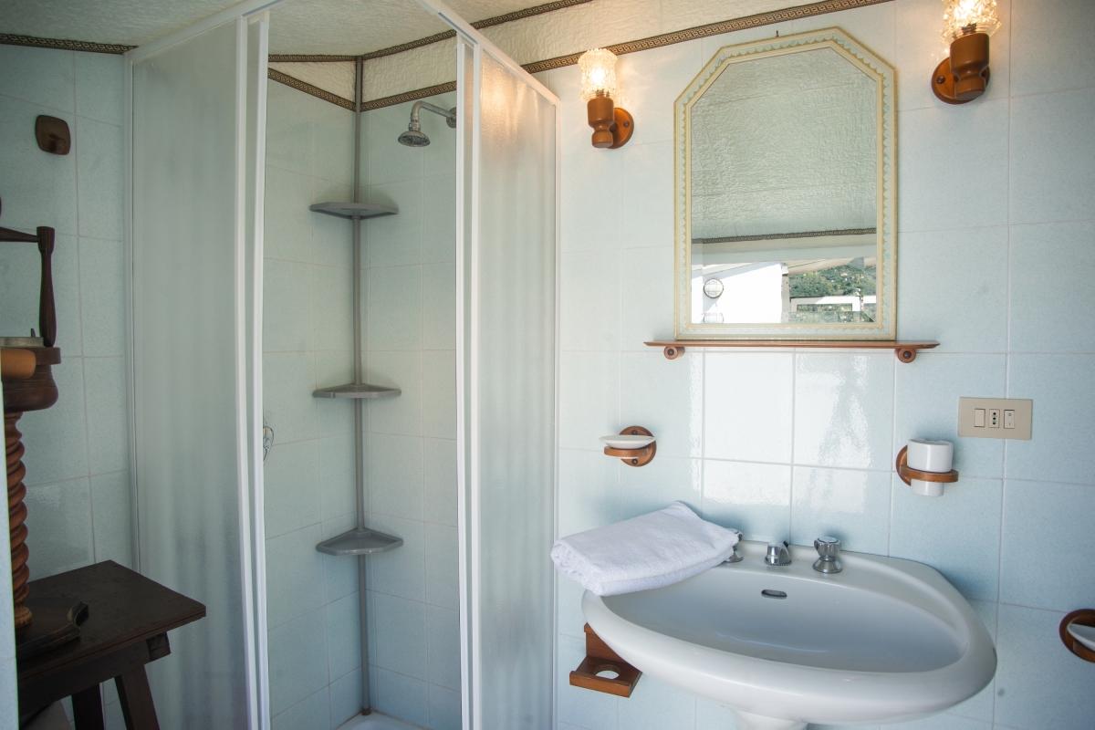 Bathroom 1: A bathroom equipped with a shower, a bidet, a WC and a basin with a mirror.