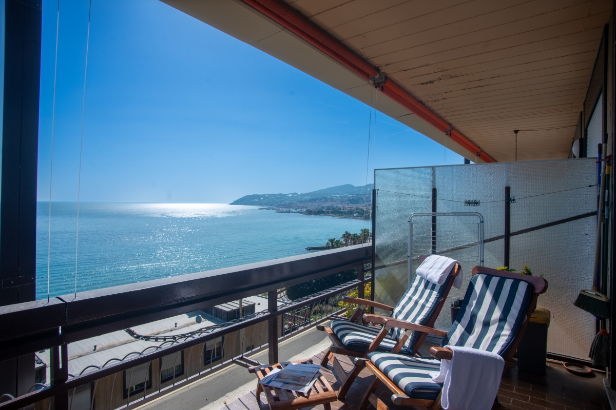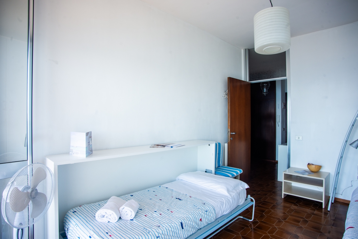 Nestled along the Ligurian Coast, this seashore apartment is located in a quiet neighbourhood of Sanremo. A tastefully designed apartment on the fourth floor, it has a private balcony with wonderful views and offers the convenience of a lift. Upon entering, you will be welcomed by the bright living room with minimal furniture like a sofa, a flat-screen TV, a dining table set and a credenza. Adjacent to this is the bedroom with a bunk bed and a single bed, accompanied by a desk and a chair, creating a suitable environment for remote workers or children.