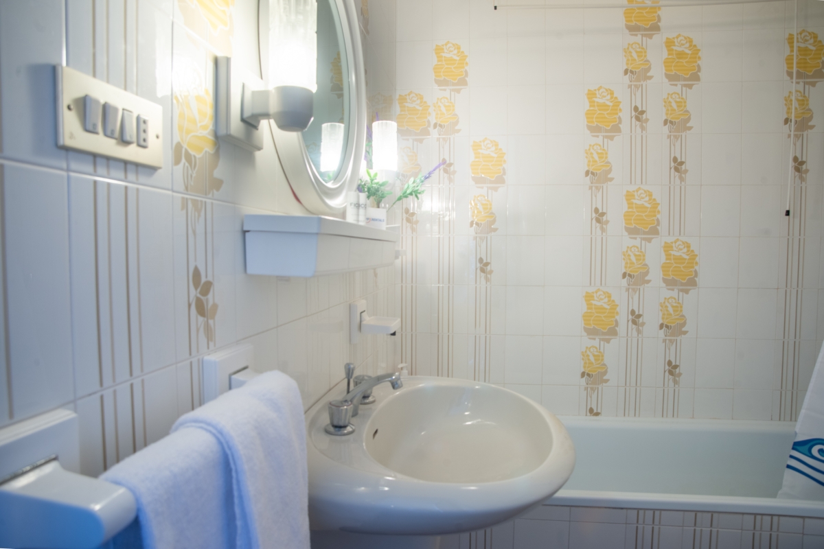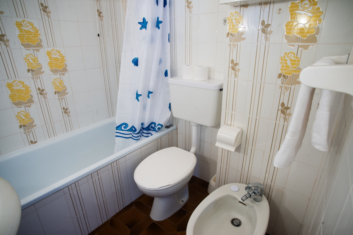 Bathroom 1: A private bathroom equipped with a bathtub with shower, a bidet, a WC and a basin with a mirror.