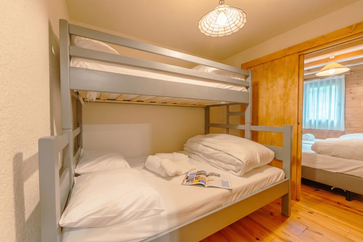 Bedroom 2: The second bedroom has a bunk bed with a double bed, an upper single bed and a wardrobe.