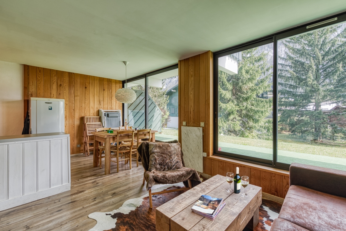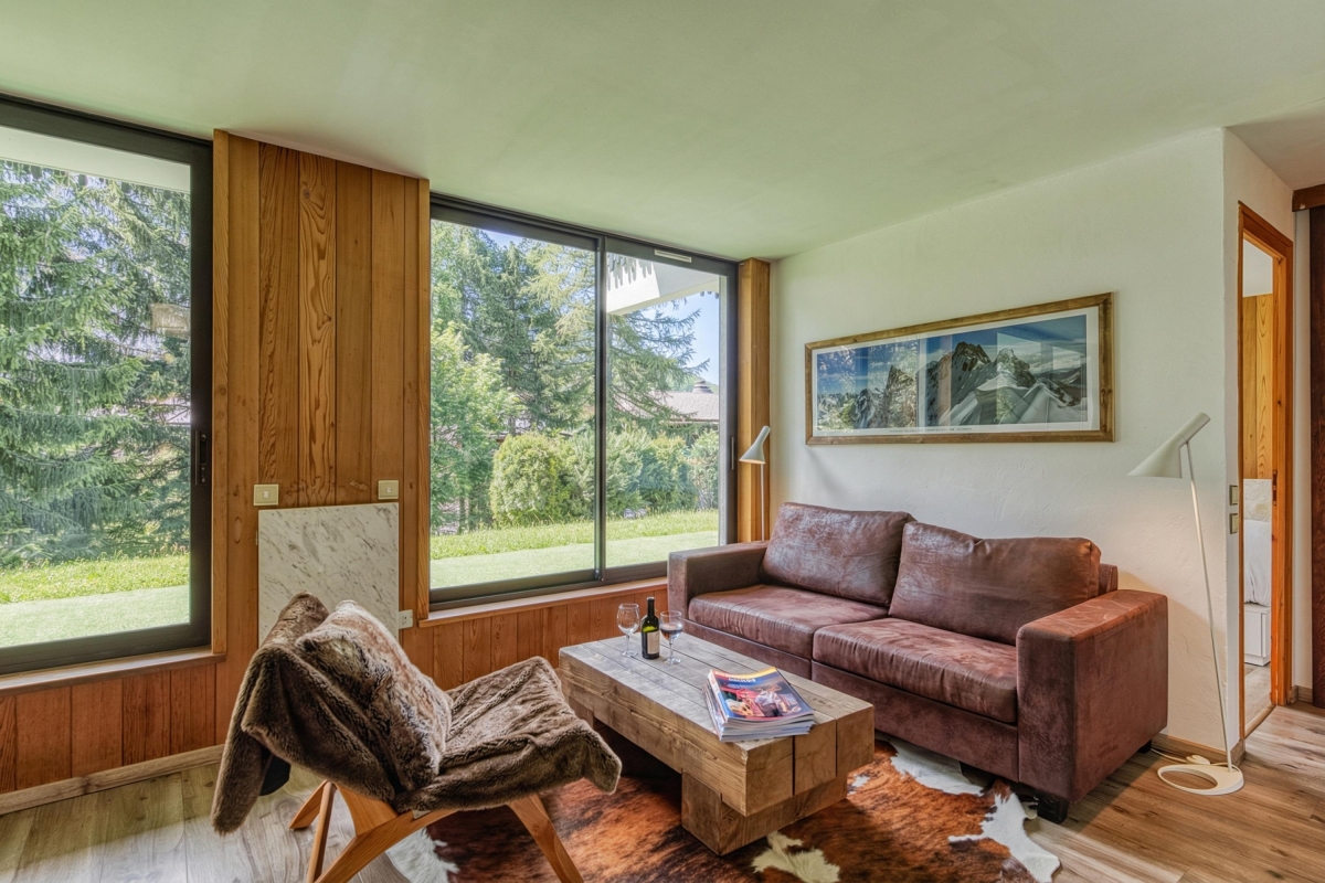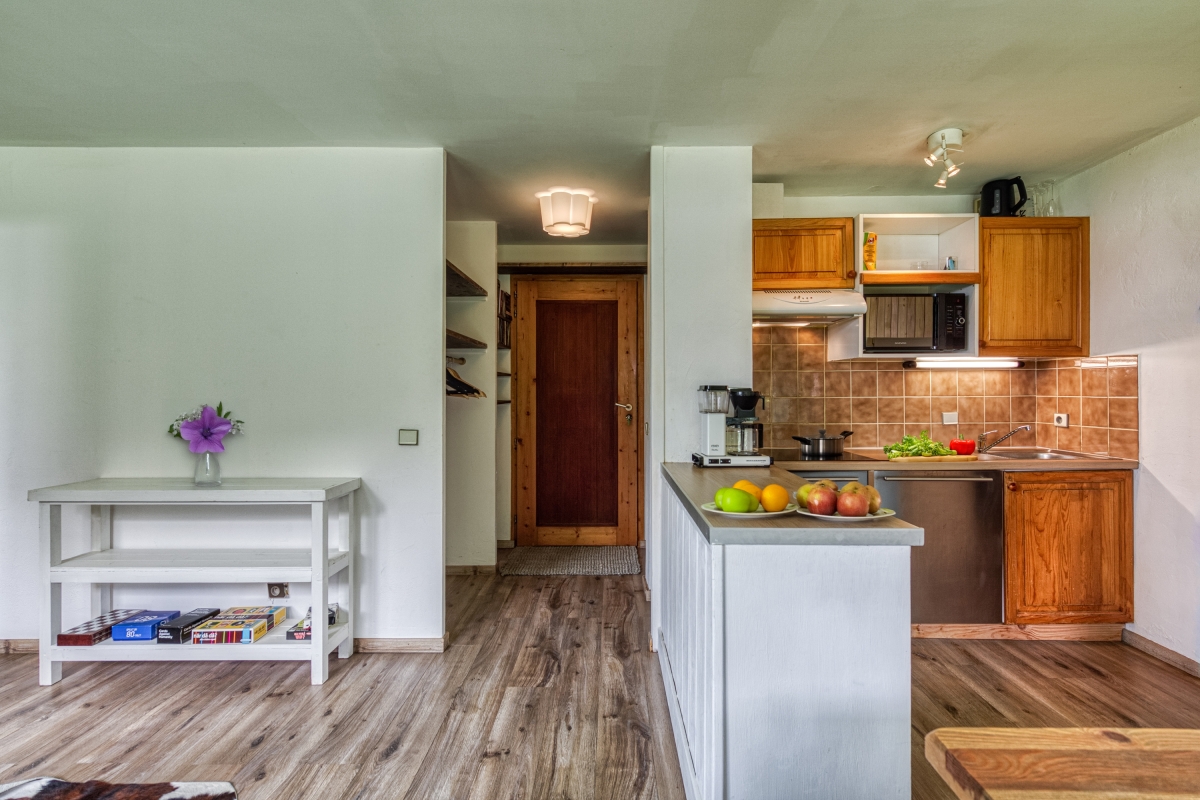 The apartment’s contemporary décor manages to be both cosy and airy at the same time, with a nod to alpine chic. The open-plan living/dining area is full of light thanks to the two sliding glass windows, which run along one side of the room. These open out onto the shared gardens, with views of the pine trees and the mountains. The room is furnished with a stylish leather finish sofa, an armchair and an attractive wooden dining table for 4 people. The kitchen area, which is next to the dining area, is equipped with a cooker hob, oven, microwave, drip coffee machine, fridge and freezer.