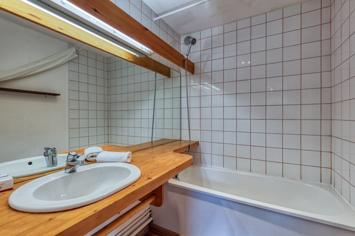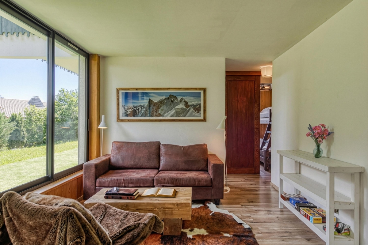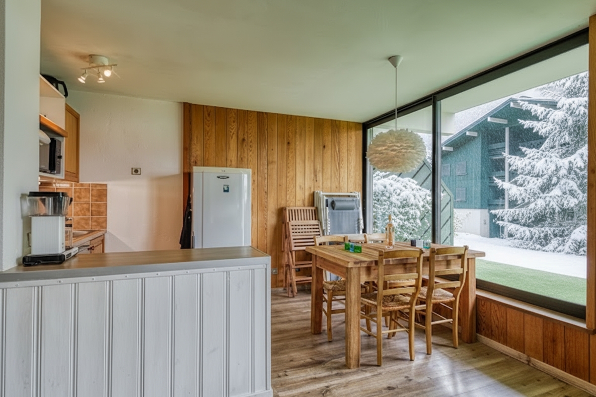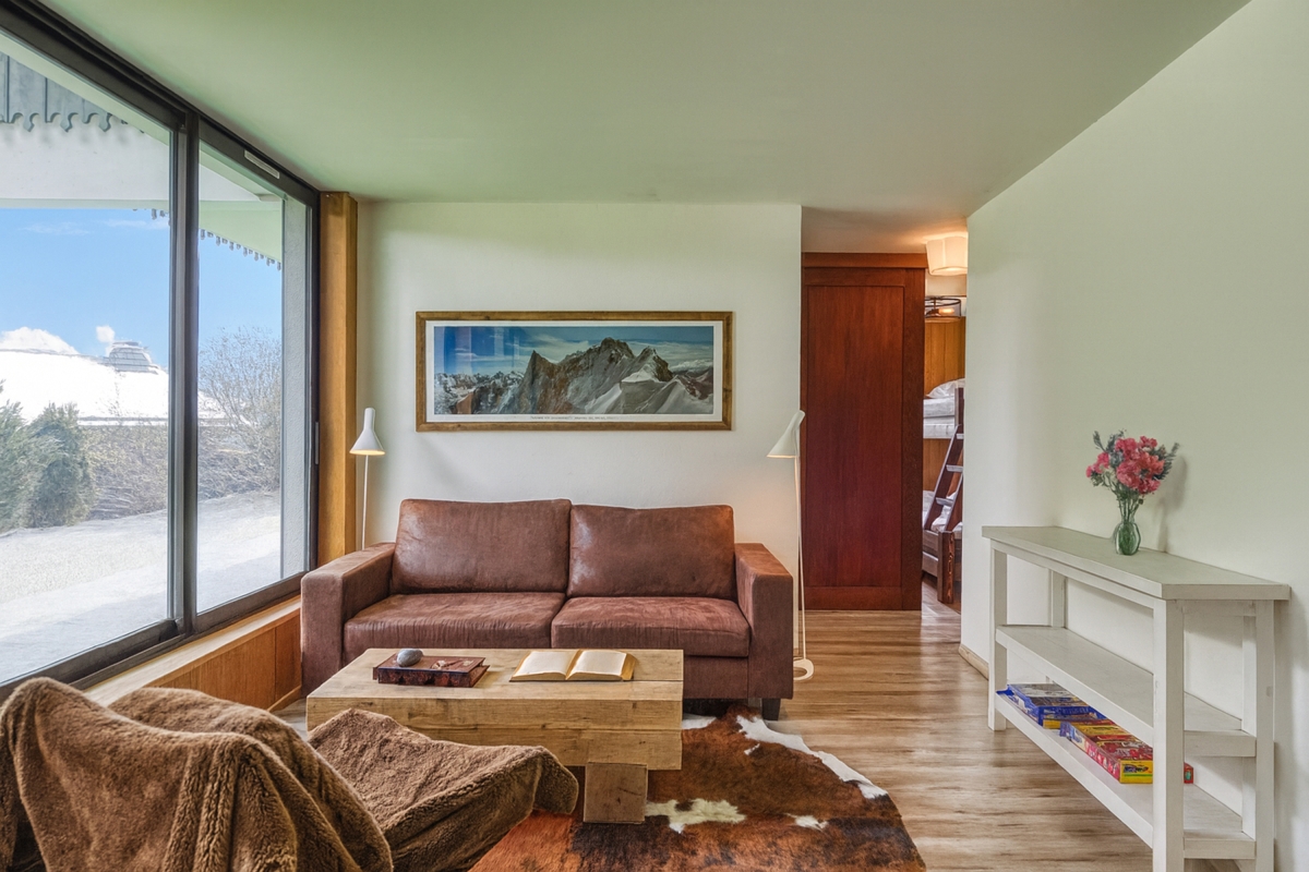 The apartment’s contemporary décor manages to be both cosy and airy at the same time, with a nod to alpine chic. The open-plan living/dining area is full of light thanks to the two sliding glass windows, which run along one side of the room. These open out onto the shared gardens, with views of the pine trees and the mountains. The room is furnished with a stylish leather finish sofa, an armchair and an attractive wooden dining table for 4 people. The kitchen area, which is next to the dining area, is equipped with a cooker hob, oven, microwave, drip coffee machine, fridge and freezer.