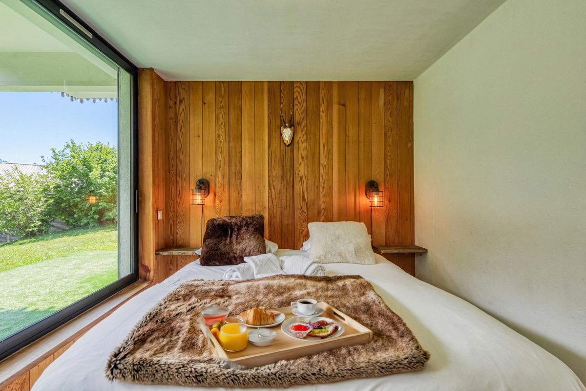 Bedroom 1: The master bedroom, partly panelled with pale wood, also has large sliding windows, which look out onto the garden and the mountains. It has a comfortable double bed.