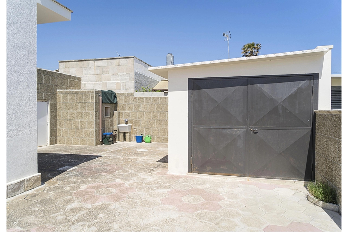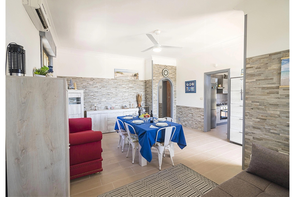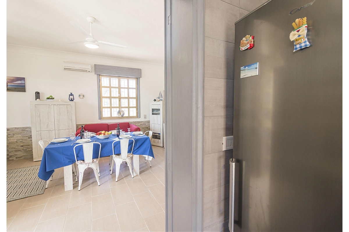 This newly renovated villa is a spacious retreat with a large outdoor space allowing for parking up to three cars. A spacious veranda has a large table, chairs, and two deckchairs, perfect for al fresco dining or relaxing. Additionally, there is an outdoor wooden shower cubicle for convenient post-beach rinses. The bright living room features two sofas, a dining area, and a smart TV. The fully-kitchen features a large fridge, a dishwasher, a cooker hob, an electric oven, a microwave, a dishwasher and two coffee makers. The two double bedrooms feature comfortable beds and wardrobes. The shared bathroom is equipped with a washing machine for additional convenience.