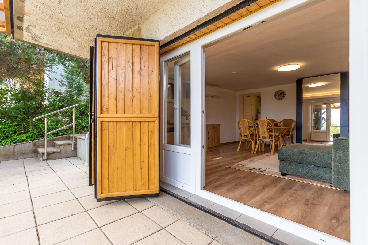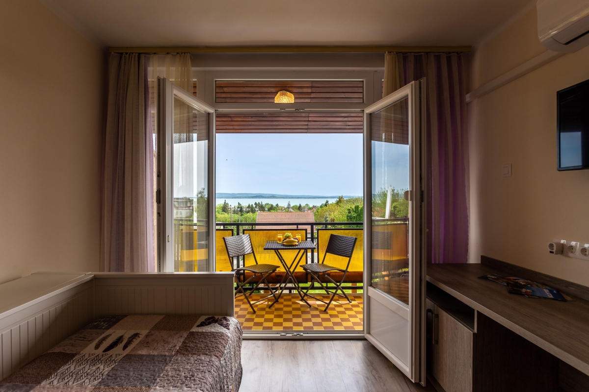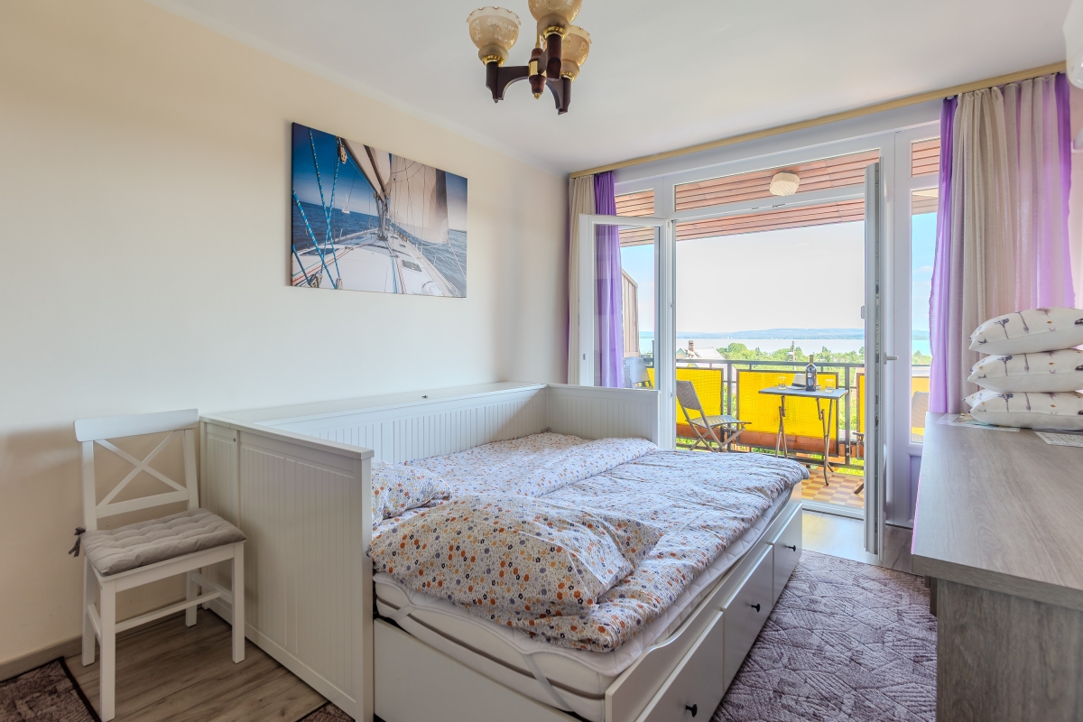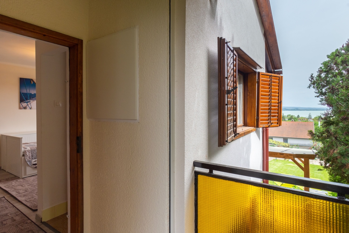 The upper floor is reached via an outside staircase and consists of a separate studio apartment complete with a kitchenette with a cooker hob, oven, fridge and dining table. There is also a living room which contains a sofa bed and a flat-screen TV. French windows open from the living room to an upstairs balcony with a table and chairs, offering views over Lake Balaton.