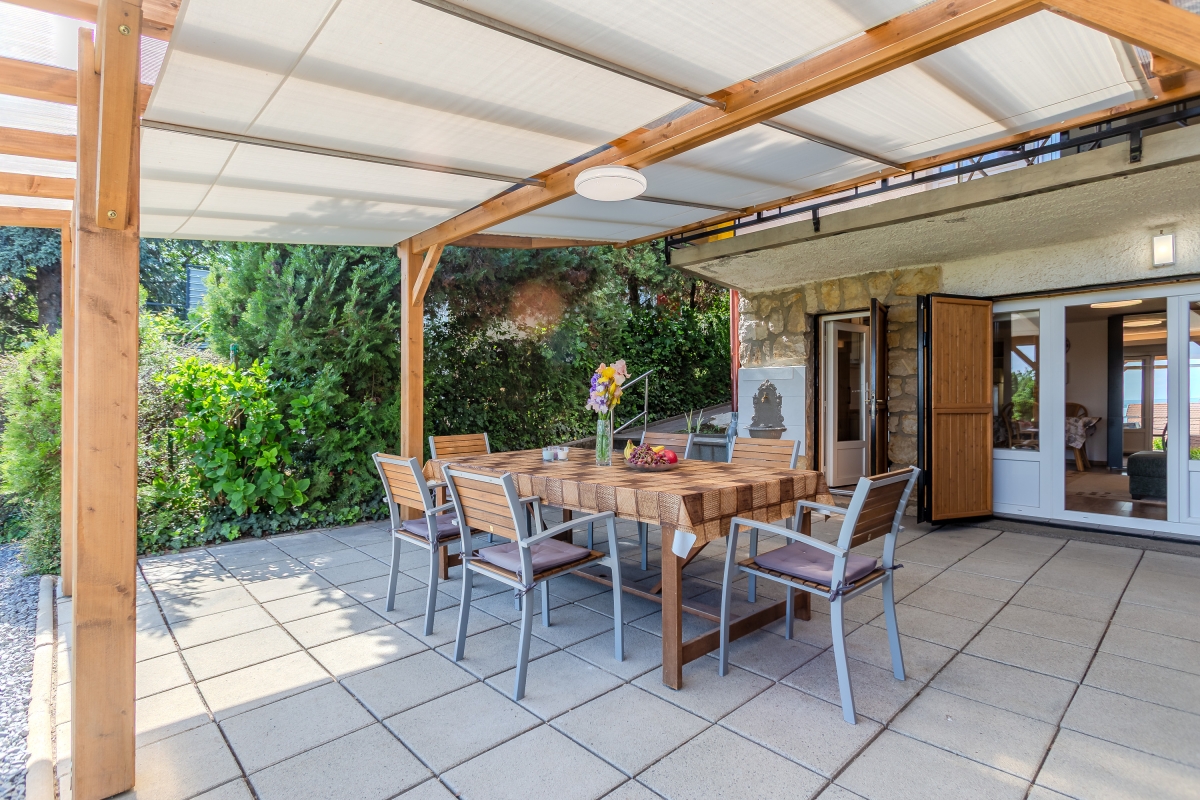 There are two gardens, one at the front and one at the back of the property. Since it is built on a slope the back garden is higher and includes a small table and chairs where guests can enjoy a glass of excellent local wine. The front garden stretches down from the terrace and has 2 loungers for relaxing in the sun. The shaded front terrace is furnished with a table and chairs for meals al fresco looking out over the lake.