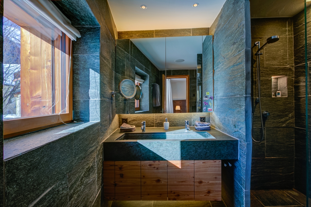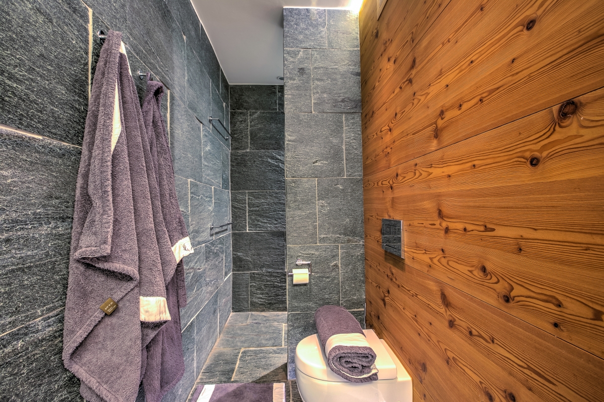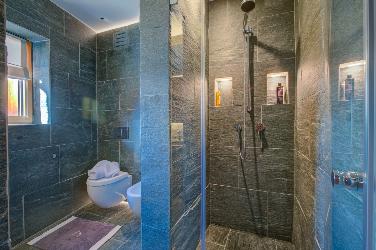 The stylish stone-tiled ensuite bathrooms all have a large glass shower, basin and WC.