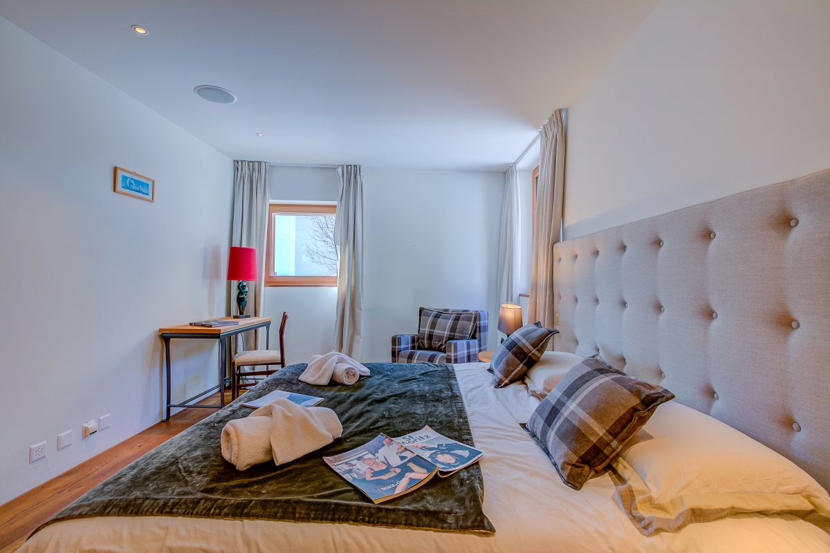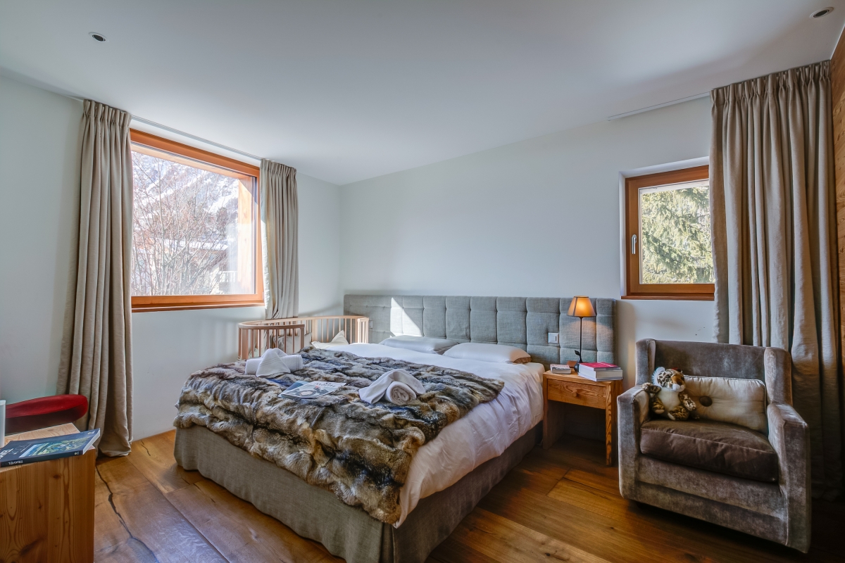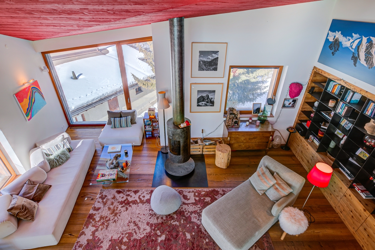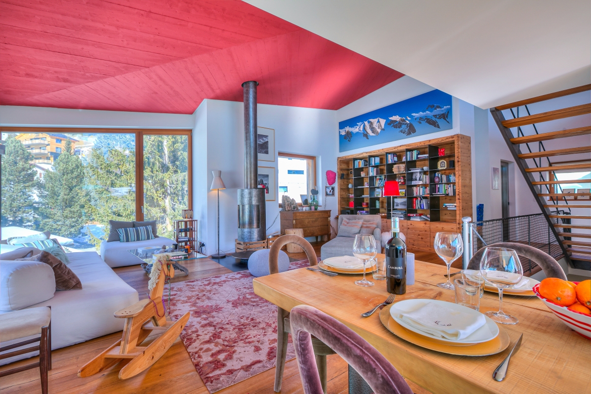 The main living space is on the first floor, with a stylish double-height sitting room, full of sunlight thanks to huge windows with panoramic mountain views. The room is furnished with a stylish sofa and chairs, plus a wood-burning stove. The mezzanine chill-out area is tucked under the eaves. Here guests can relax and enjoy the mountains thanks to a huge corner window. Back downstairs, the dining area leads off the main sitting room with a large table and chairs. Sliding glass doors open out onto a wide, corner balcony furnished with a coffee table and chairs, looking out over the mountains.