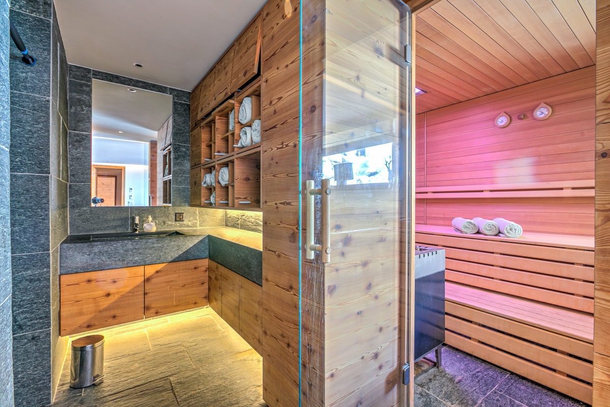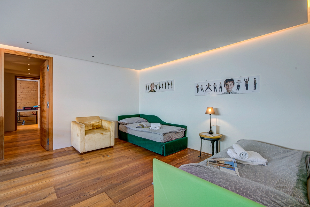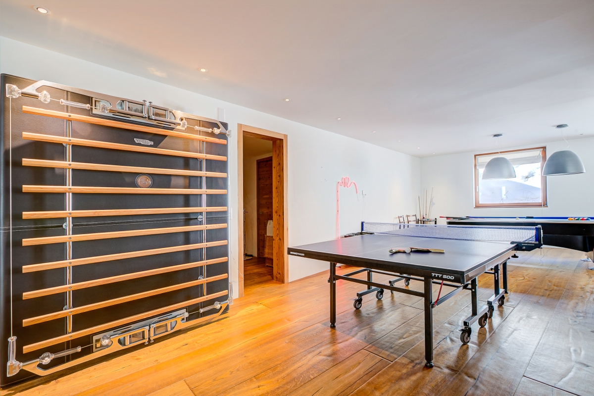 The house is full of light and finished to the very highest standards, with natural elements; stone, wood and open metal stairs. On the ground floor, there is a spacious games room, with ping pong tables, a pool table, gym equipment, comfortable sofas, armchairs and a flat-screen TV.