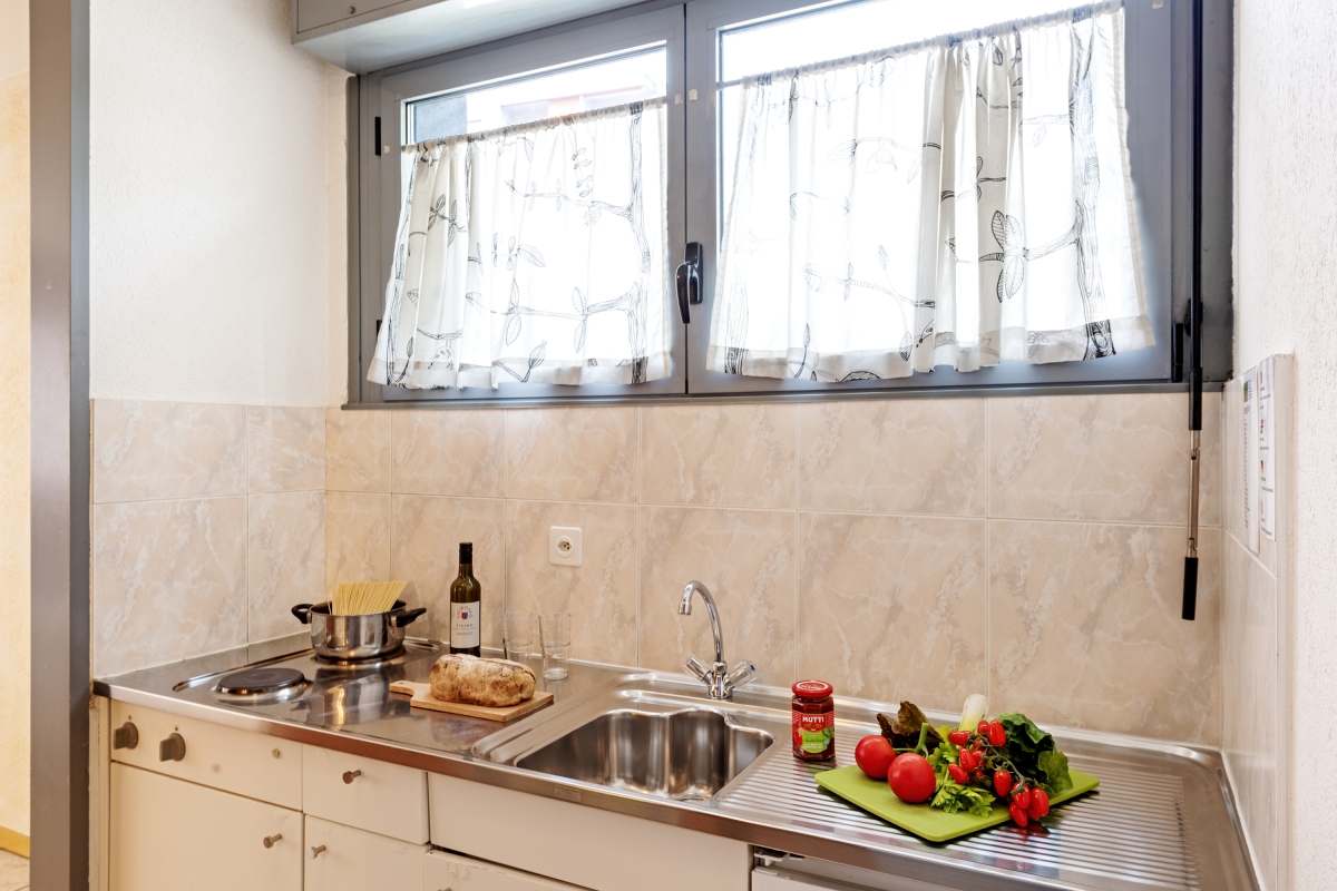 The apartment has been carefully appointed with everything guests might need for a relaxed stay. The light-filled main room is furnished with two single beds, a wardrobe plus a dining table and chairs. The adjacent kitchenette is equipped with an electric heating plate and fridge-freezer.