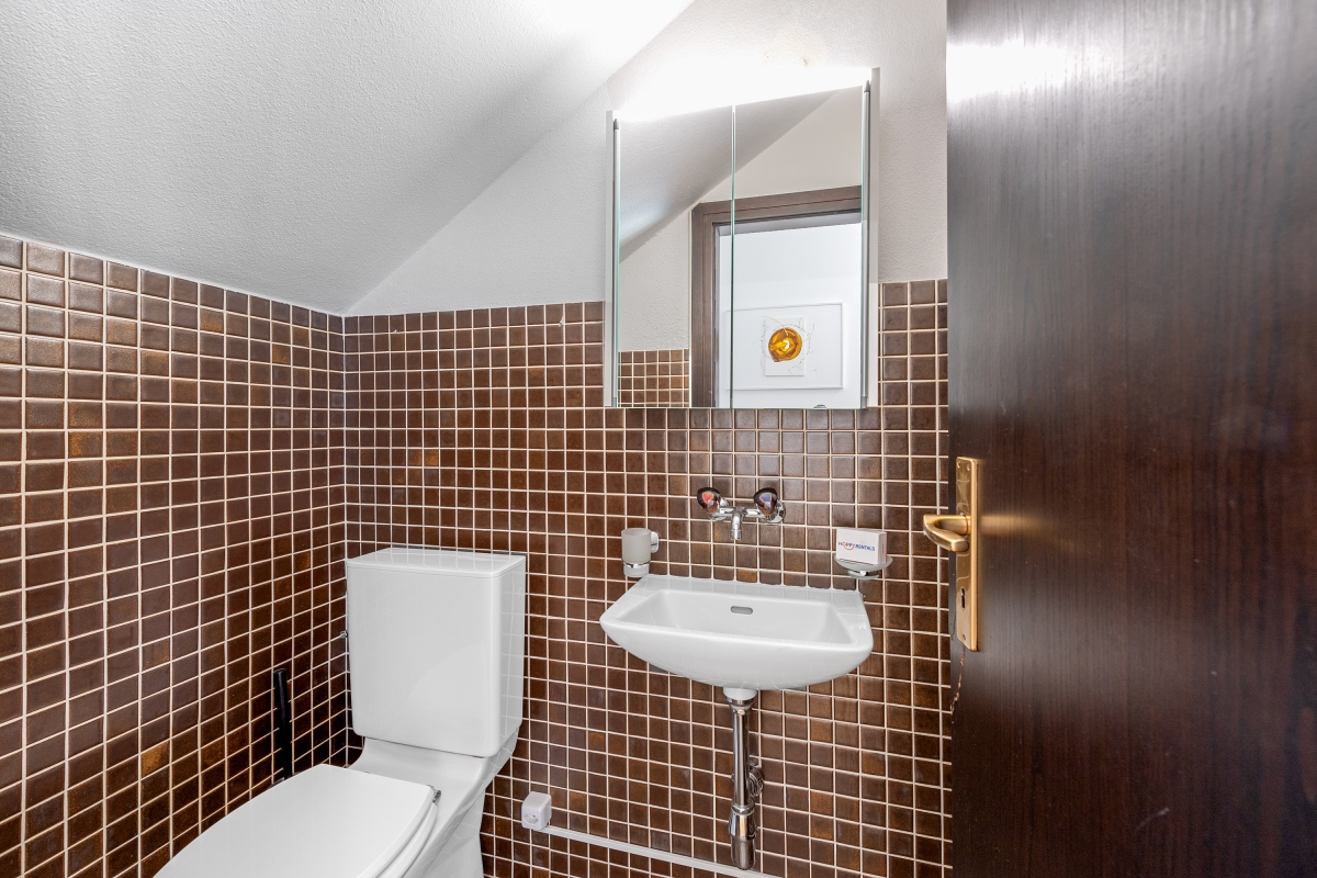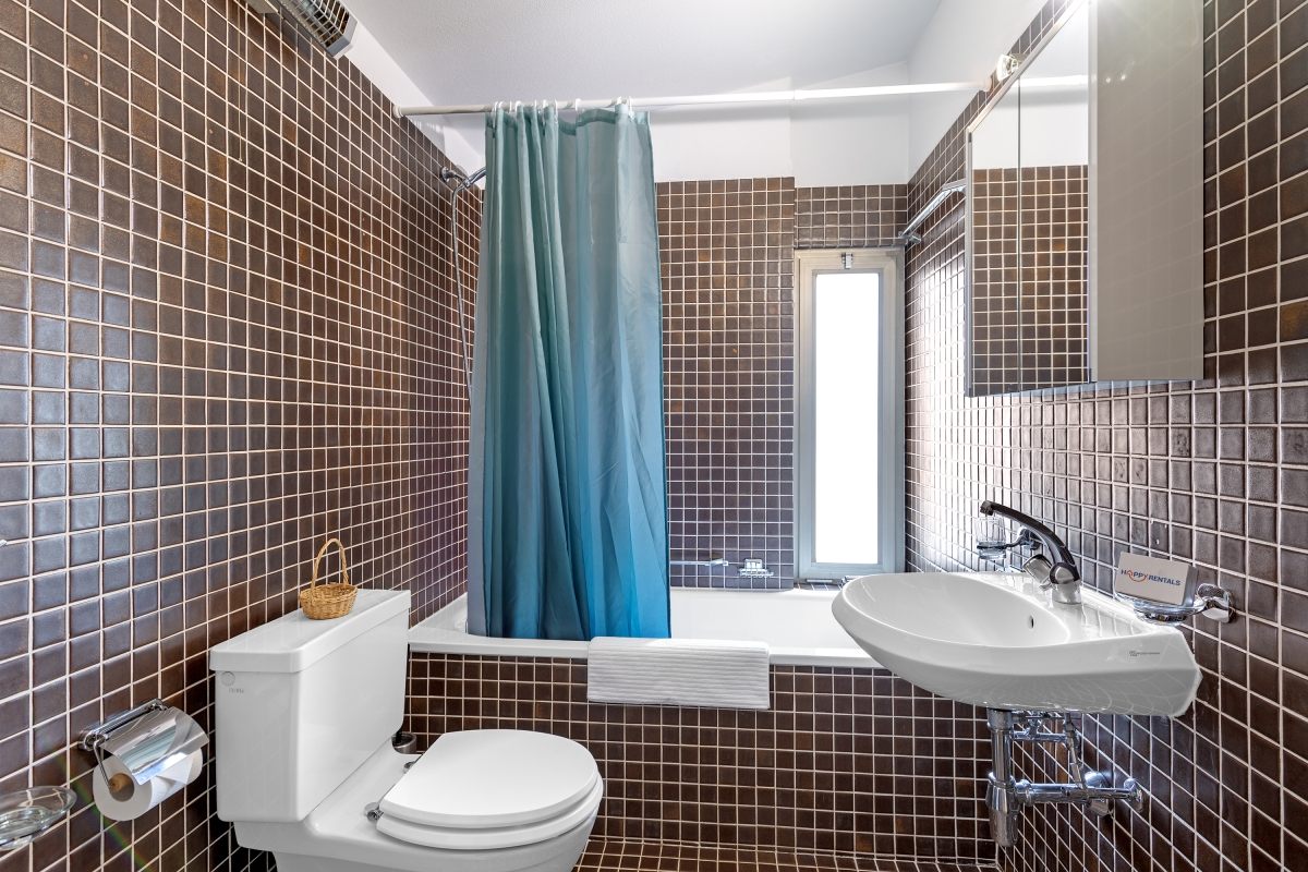 The full modern bathroom has a bathtub with shower, bidet and WC.
