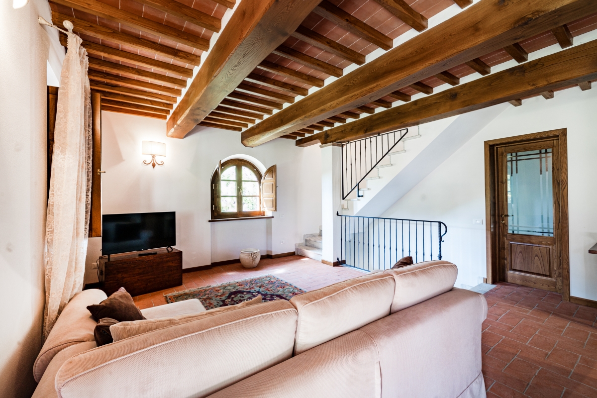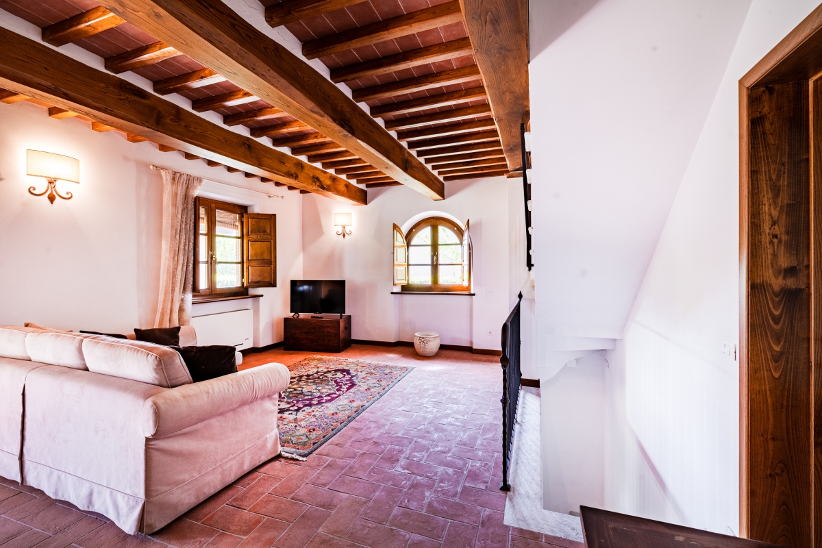 The interior is reminiscent of a traditional Tuscan villa with high wood-beamed ceilings, terracotta tiled floors, large open fireplaces and shuttered windows.