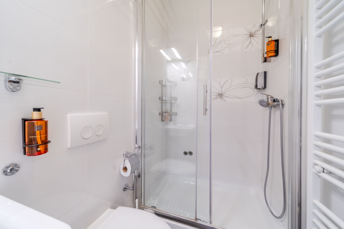 A modern bathroom with a shower and WC.