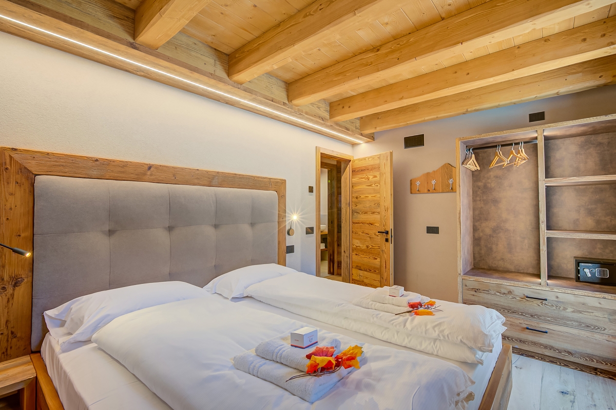 Bedroom 1: A stylish bedroom featuring the typical exposed-bean wooden ceiling along with a king-size double bed, wall-mounted TV and a wardrobe.