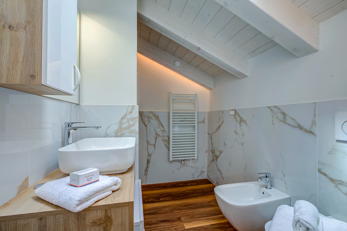 This peaceful apartment occupies the upper floor and has wonderful views out over the mountains. The open plan living/dining area with modern, fitted-kitchen has wooden floors and large windows. A door leads directly onto a private balcony, where guests can sit and enjoy the scenery. The sitting area has a large, stylish sofa and flat screen tv. The dining table for 6 is next to the kitchen. This is fully equipped with an induction hob, dishwasher, microwave, fridge/freezer and coffee machine.