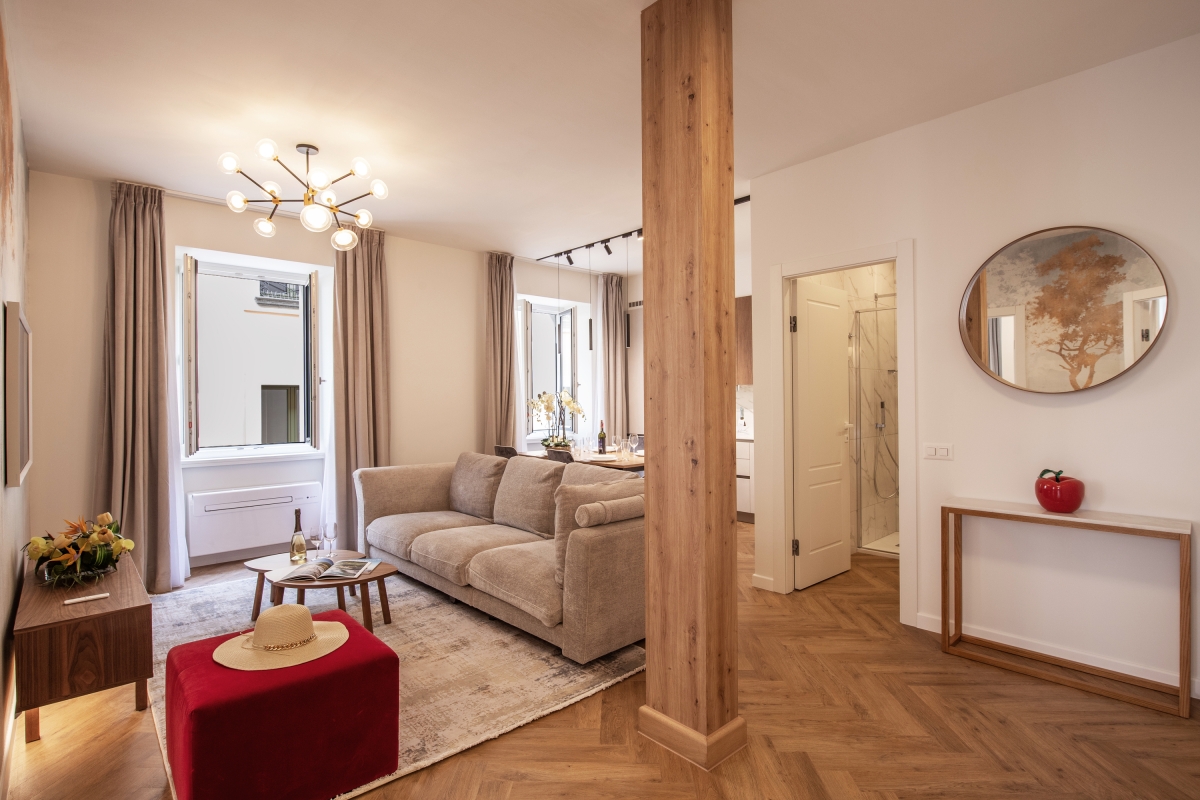 This modern apartment is perched on the 3rd floor of a 4-story building. The bright open living area has a sofa, smart TV and dining space. The kitchen features essential appliances including a Nespresso coffee machine, dishwasher, electric kettle, microwave, oven, toaster, and full fridge. Free Wi-Fi and laptop-friendly workspace ensure comfort for remote working.