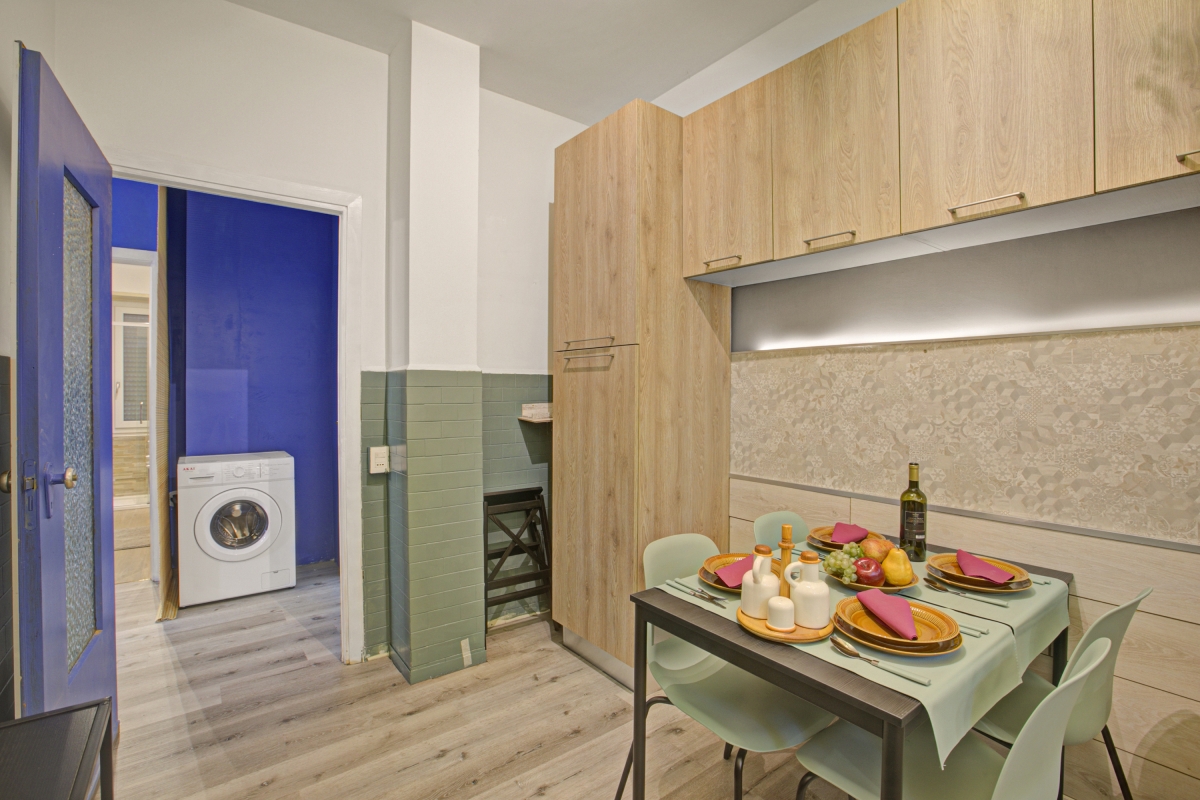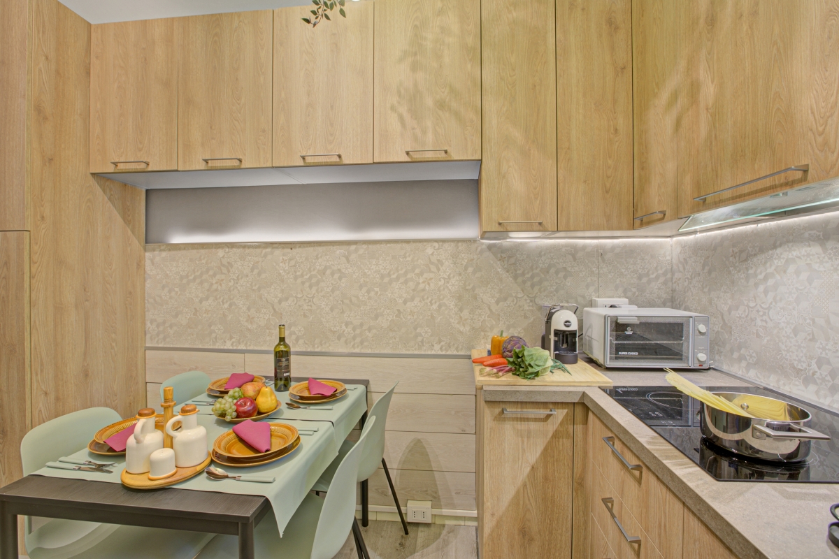 Upon entering, you will find a corridor leading you to the balcony which is also equipped with a table and chairs for you to sip your lazy morning coffees or dine alfresco. Guests have access to a shared garden as well. The apartment has a well-organized modern kitchen that provides utilities like an induction hob, a coffee machine, an electric kettle, an oven, a toaster and a fridge with a freezer. It also has a separate dining table set.