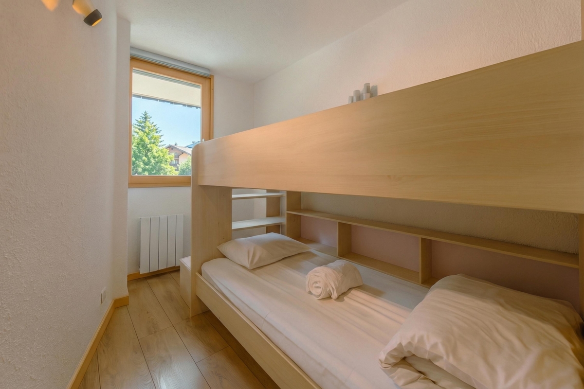 Bedroom : A light and airy child-friendly room furnished with a set of bunk beds & wardrobe