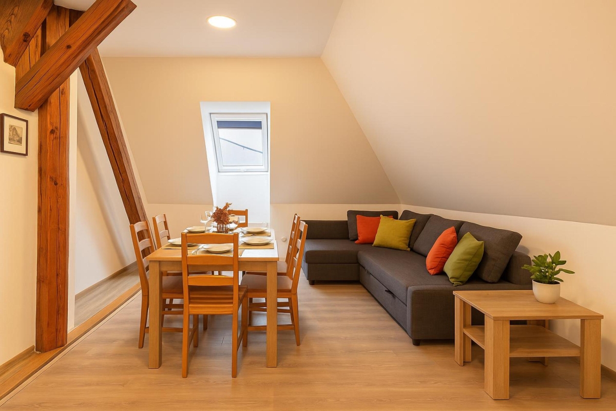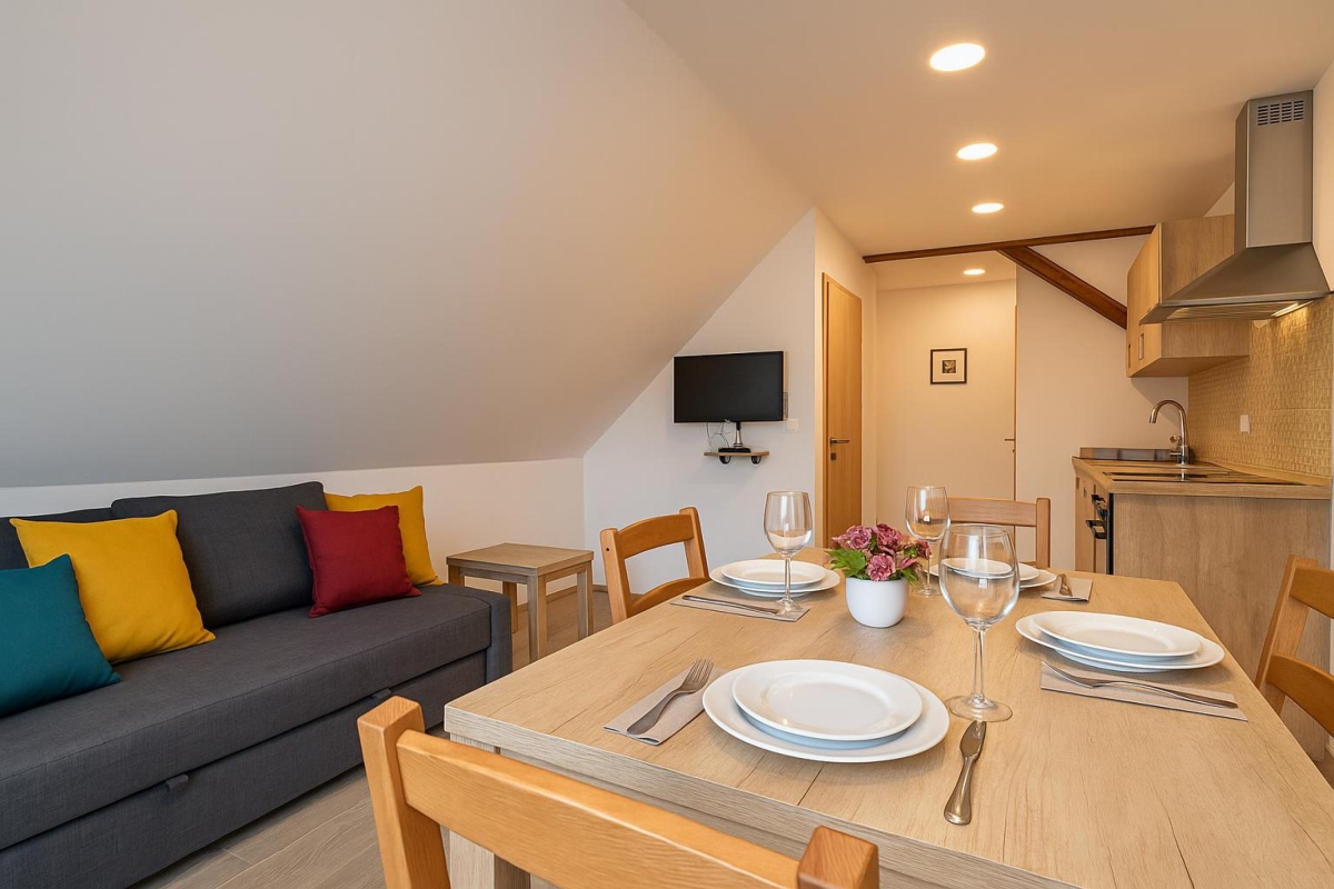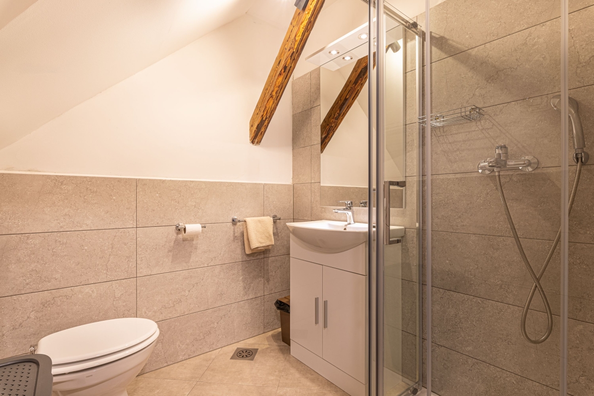 Tucked under the eaves, the apartment has an open-plan living/dining area with modern décor. The seating area is furnished with an L-shaped sofa and flat-screen TV. The dining table separates the sofa from the smart, fitted kitchen. The kitchen is well-equipped with a cooker hob, oven, fridge and kettle, for easy catering.