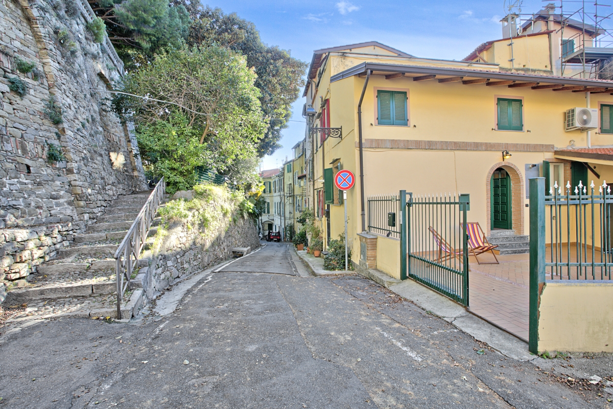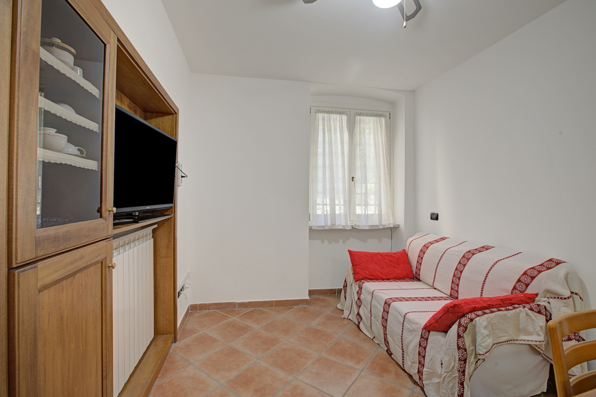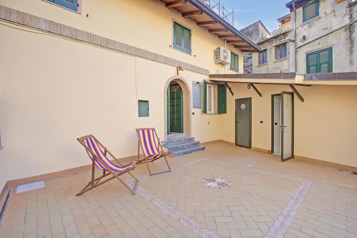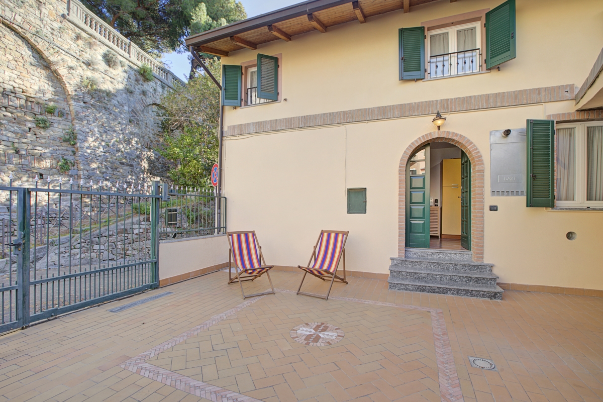 Nestled along the Ligurian Coast, this apartment is located in a quiet neighbourhood in the historic centre of Sanremo. A tastefully designed home on the ground floor, it features two bedrooms and a bright living room to host up to 5 guests. Upon entering, the gate opens onto a private verandah with deck chairs to soak in the sun and relax. As you walk inside, an inviting living room with a comfortable sofa, a dining table with chairs and a flat-screen TV await your relaxation. The apartment is a blend of painted walls and wooden roofs that keep the interiors warm and cosy.