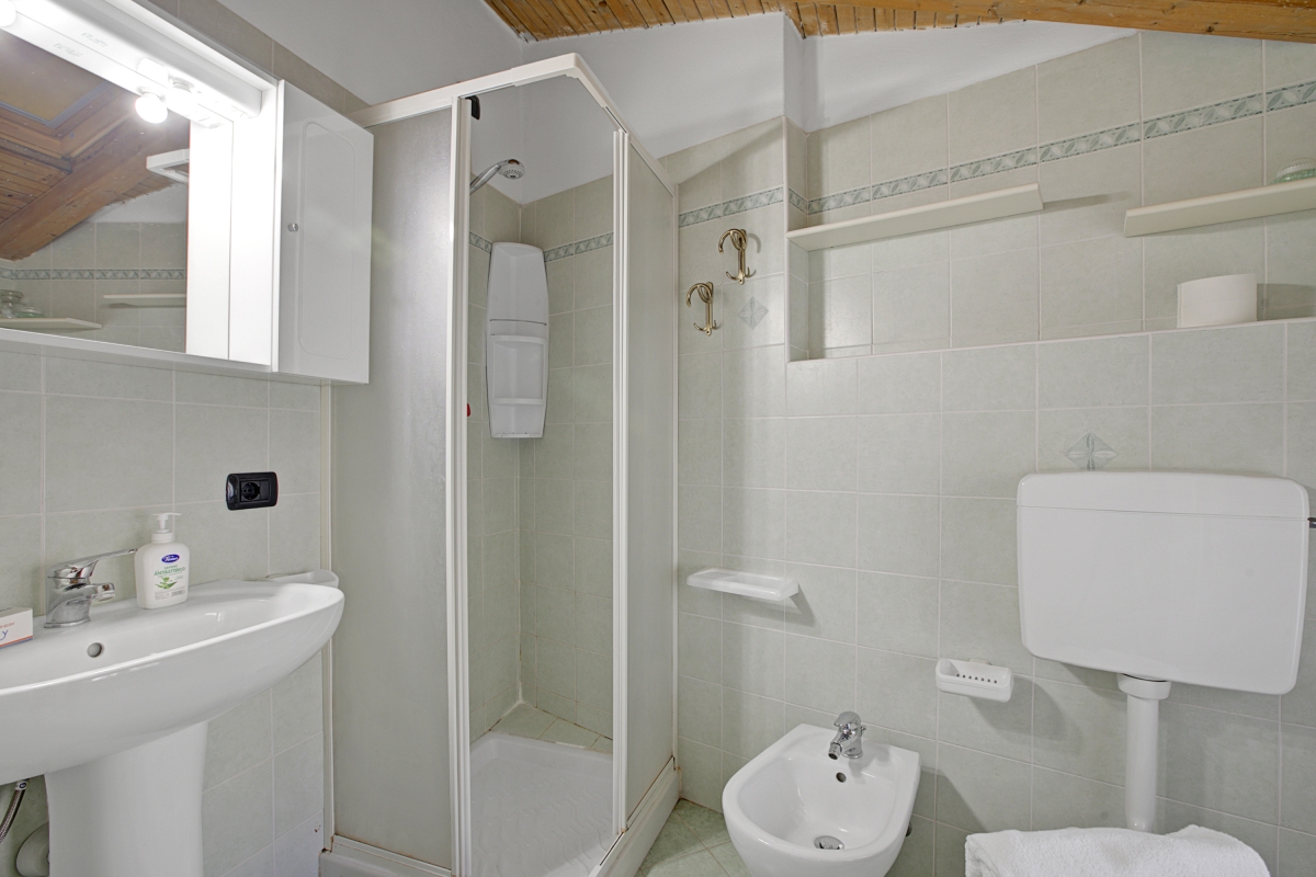 A bathroom equipped with a shower, a bidet, a WC and a basin with a mirror.