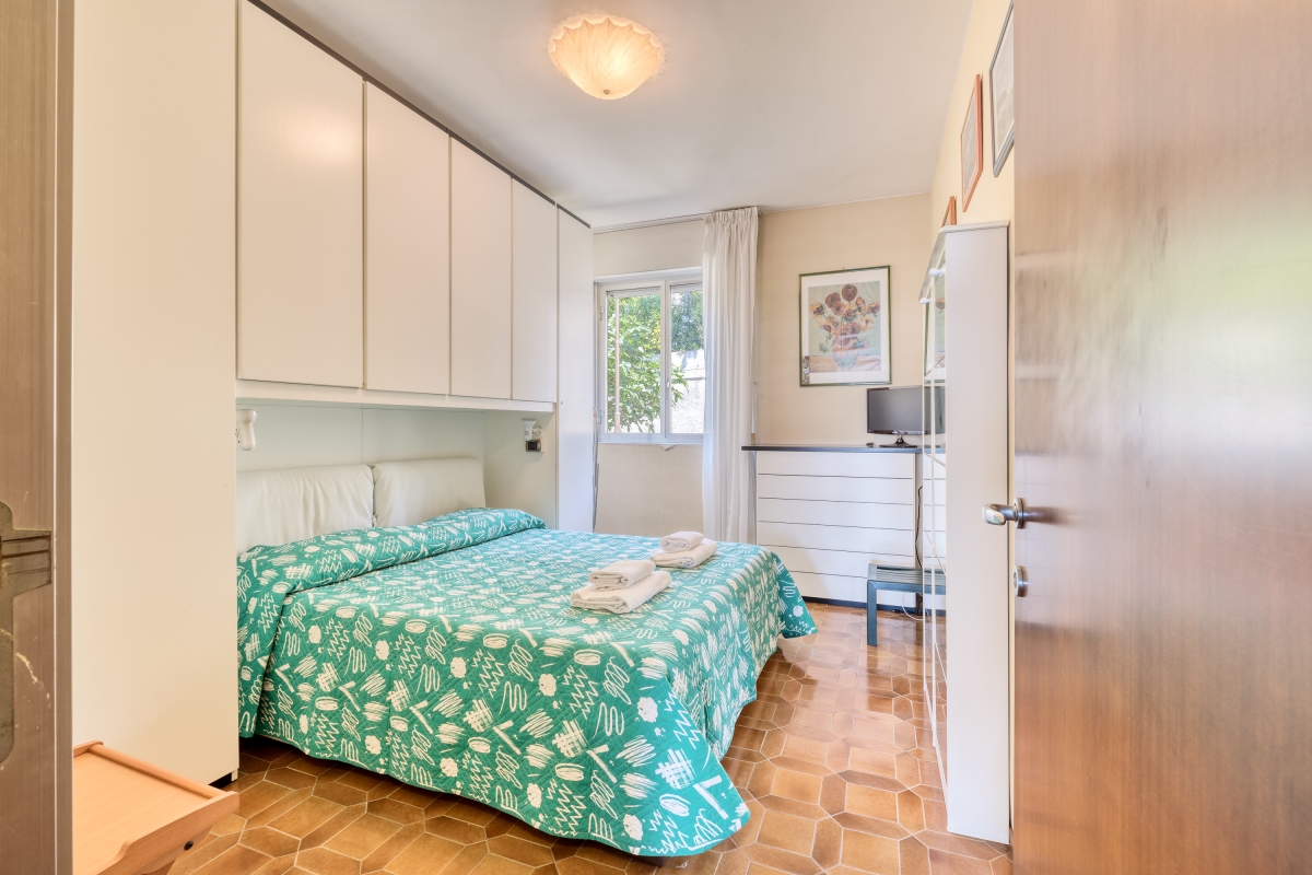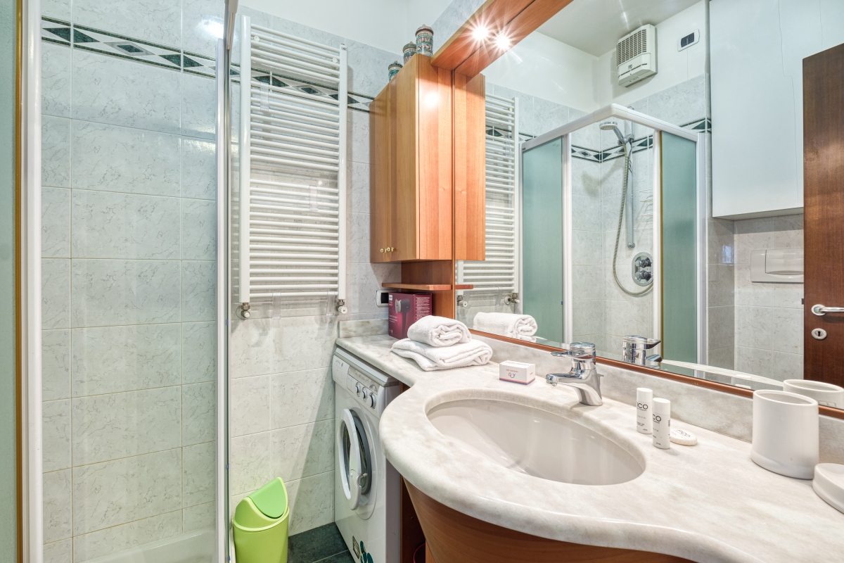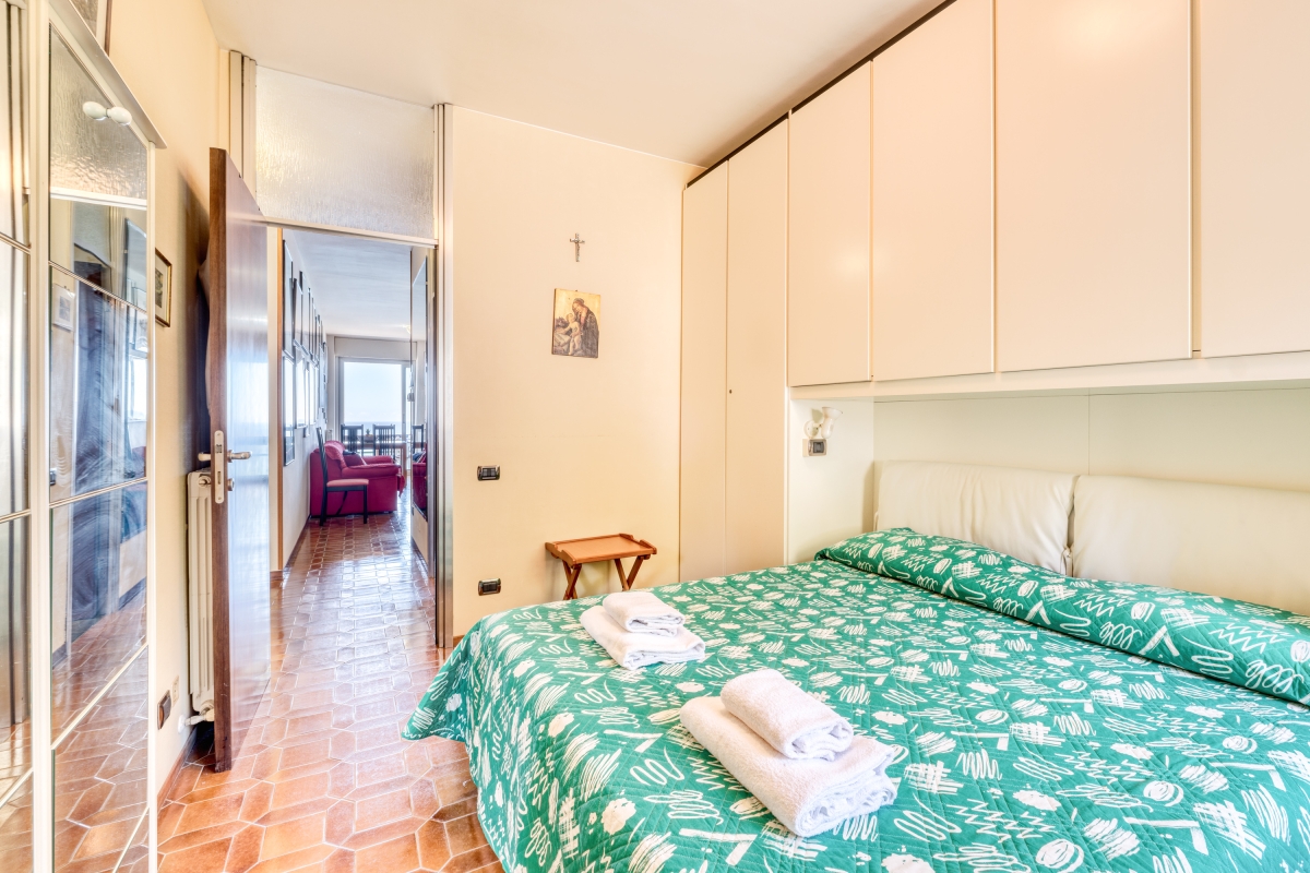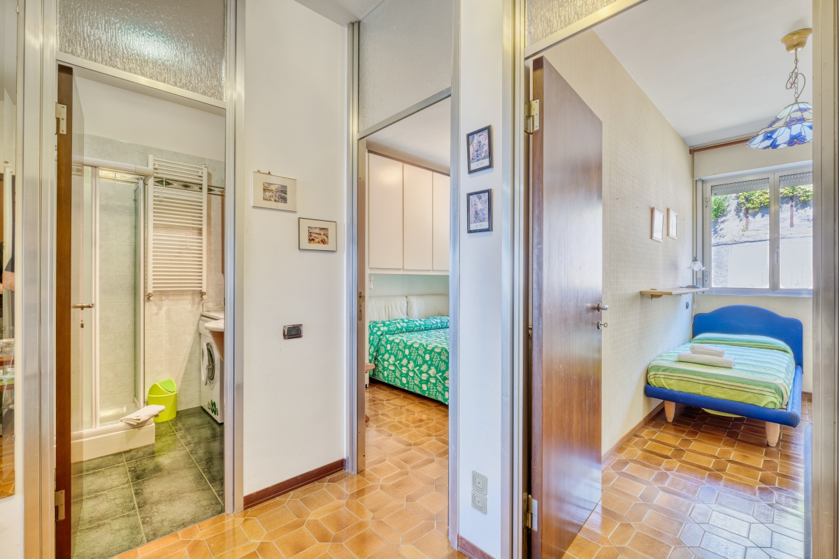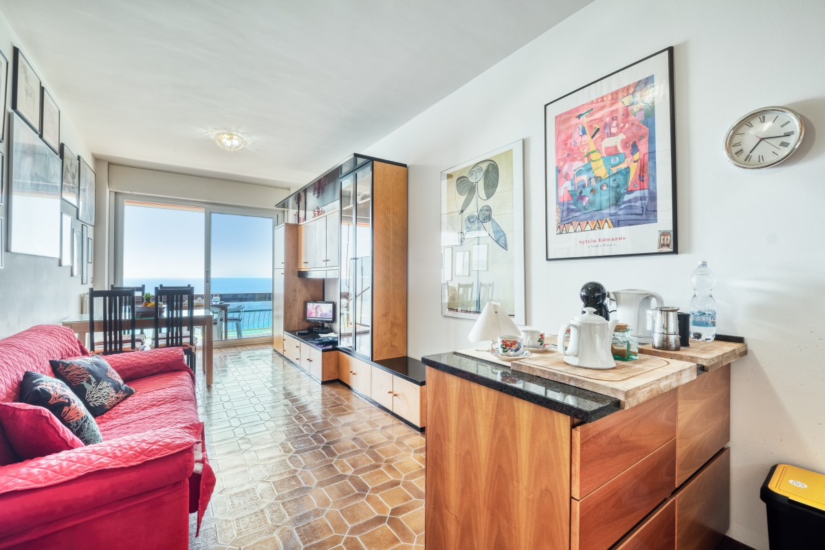 Nestled along the Ligurian Coast, this two-bedroom apartment is located in a quiet neighbourhood on the seashore. A tastefully designed apartment on the third floor, it has a private balcony with breathtaking sea views and offers the convenience of a lift. Upon entering, you will be welcomed by an open-plan living room seamlessly connected with the kitchen. It is a bright and spacious living area furnished with a sofa, a flat-screen TV, an open showcase, and a dining table set, providing pleasant views from inside. You can find essential utilities like an induction hob, a coffee machine, an electric kettle, a microwave, a food processor, and a fridge with a freezer at your disposal; a countertop table in the kitchen is an additional convenience.
