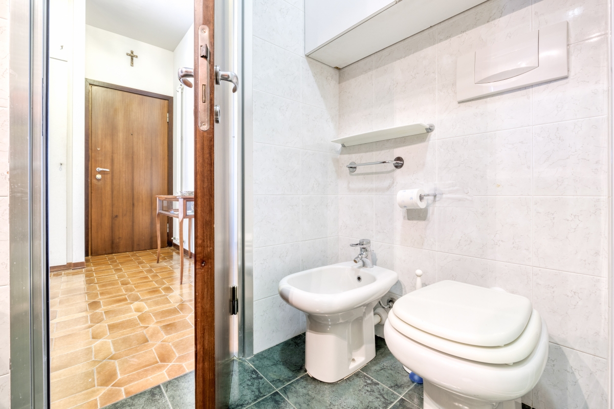 Bathroom 1: A private bathroom equipped with a shower, a bidet, a WC and a basin with a mirror.