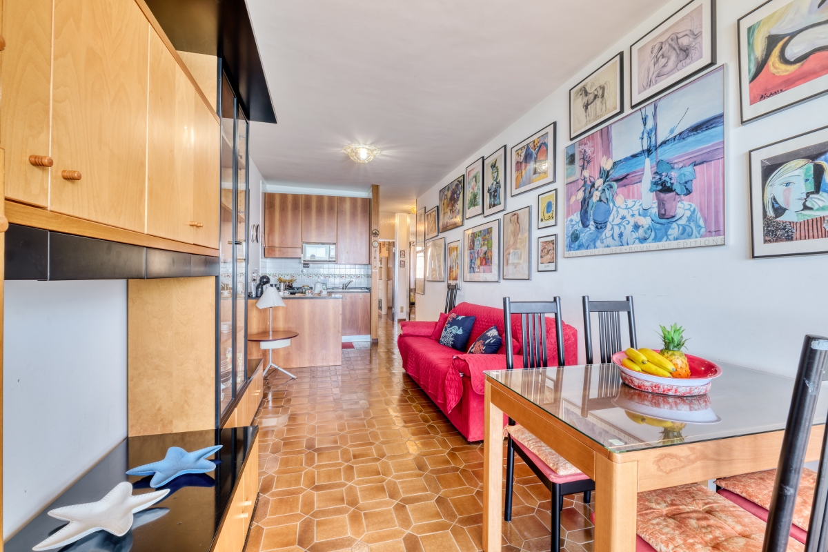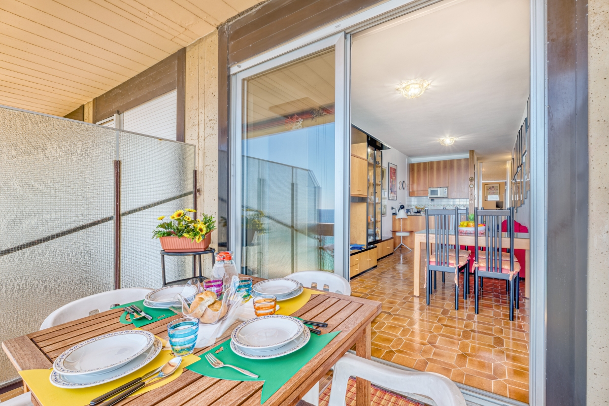 There is a French Door in the living room opening onto the balcony that is equipped with a dining table set, ideal for outdoor dining in the fresh air with sea views. Back inside, are two bedrooms, one with a double bed and the other with two single beds, perfect to accommodate 4. This sunlit apartment exudes warmth and a soothing ambiance making it an ideal base for guests of all age groups.