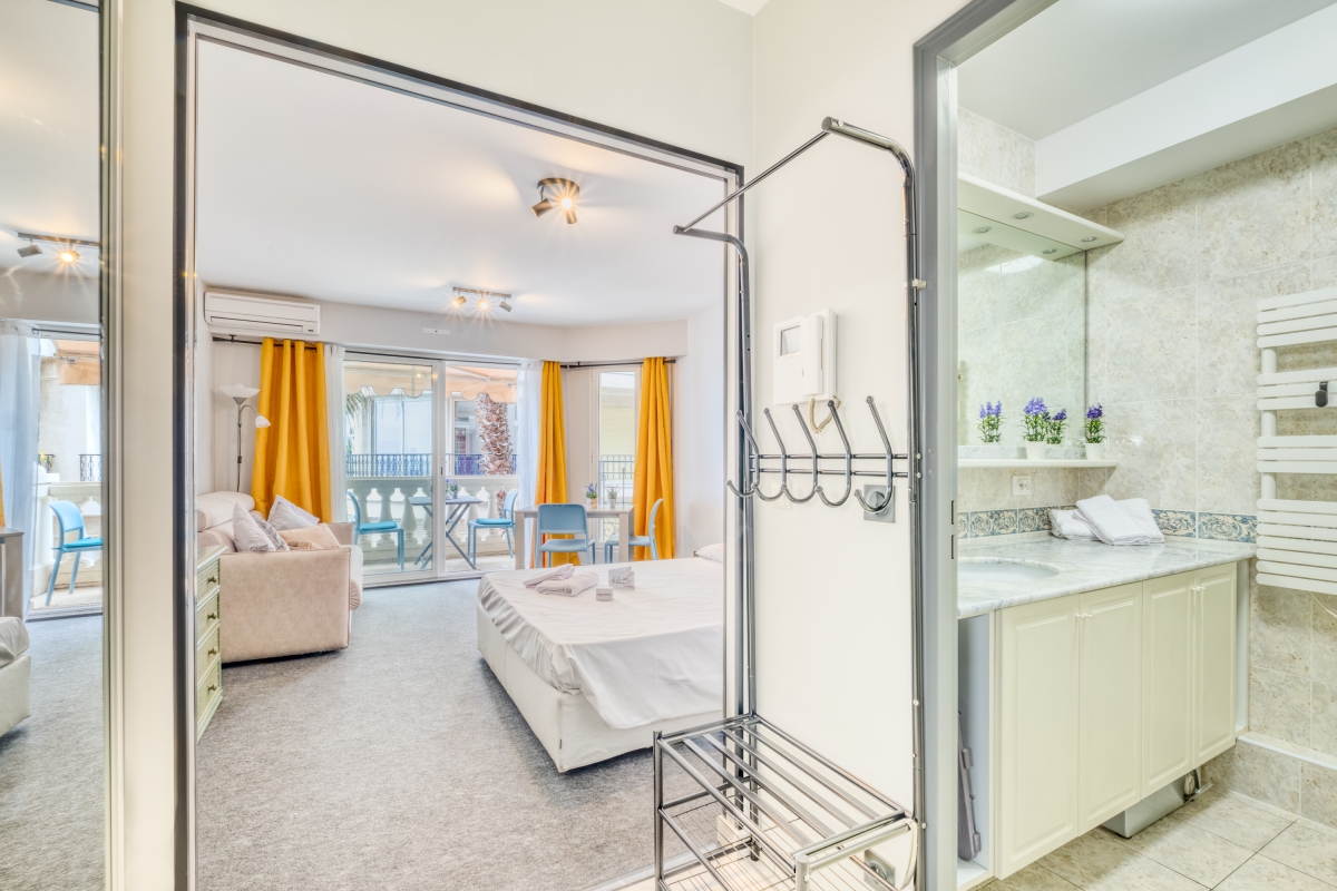 Located just a minute from several stunning beaches, this cosy, air-conditioned apartment features an inviting open-plan living area. Enter through the main door into the bright living space, with a sofa tucked in one corner and a double bed comfortably positioned in the other. An attached balcony overlooks the Mediterranean Sea. Enjoy al-fresco meals or relax watching the beautiful sunsets over the sea; this space is perfect for all. A well-equipped kitchen and a bathroom are located opposite the living space.
