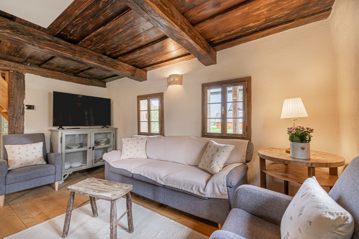 Inside, the cottage combines rustic charm with modern amenities. The living room is a cosy haven with plush sofas and a smart TV. It opens to a dining area that comfortably seats seven, creating an ideal spot for enjoying meals together. The fully-equipped kitchen boasts a dishwasher, Nespresso coffee machine, oven, toaster, and fridge, ensuring a home-away-from-home experience. Additional comforts include a library of books and games and complimentary Wi-Fi, ensuring entertainment for all ages.