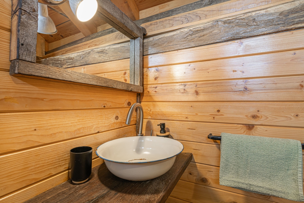 The cottage’s beautifully crafted interior features a compact kitchenette equipped with a cooker hob, electric kettle, and a fridge with freezer. The living area is furnished with a comfortable sofa, where you can unwind with your favourite book or enjoy free Wi-Fi access. Meals can be enjoyed at the dining table, suitable for up to 4 guests, creating a homely atmosphere for your stay.
