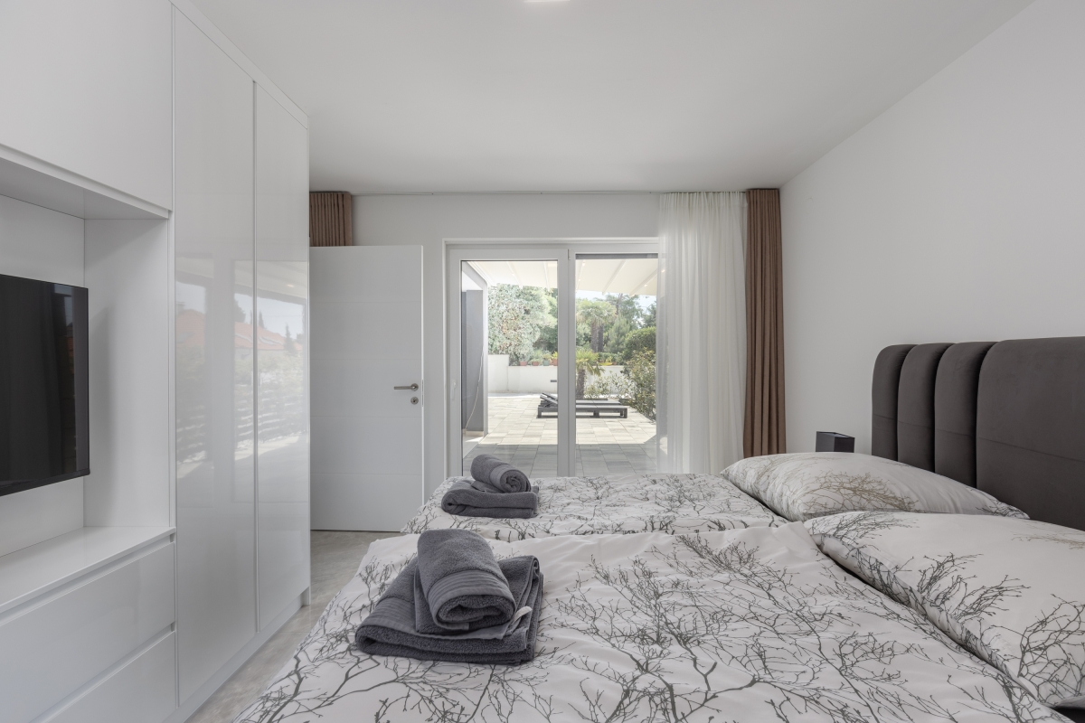 Bedrooms 1 - 3: All three bedrooms are furnished with a king-sized double bed, a flat-screen TV, a wardrobe and French windows which open onto the terrace.
