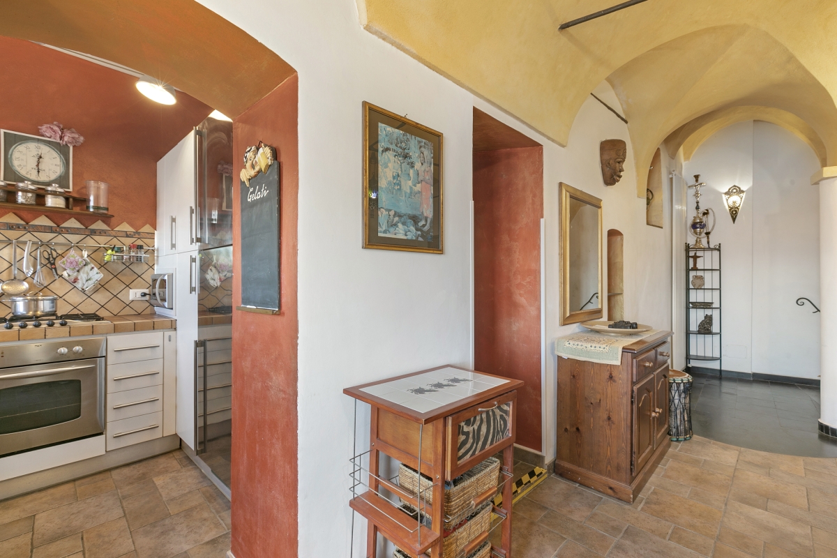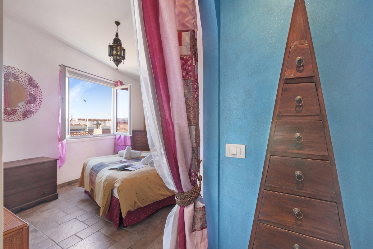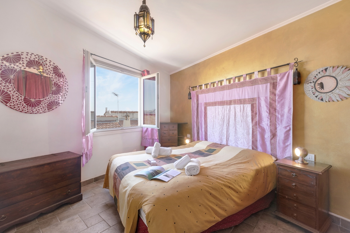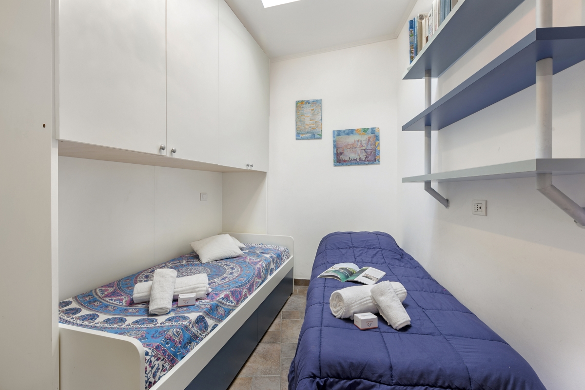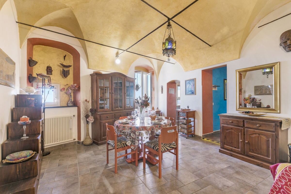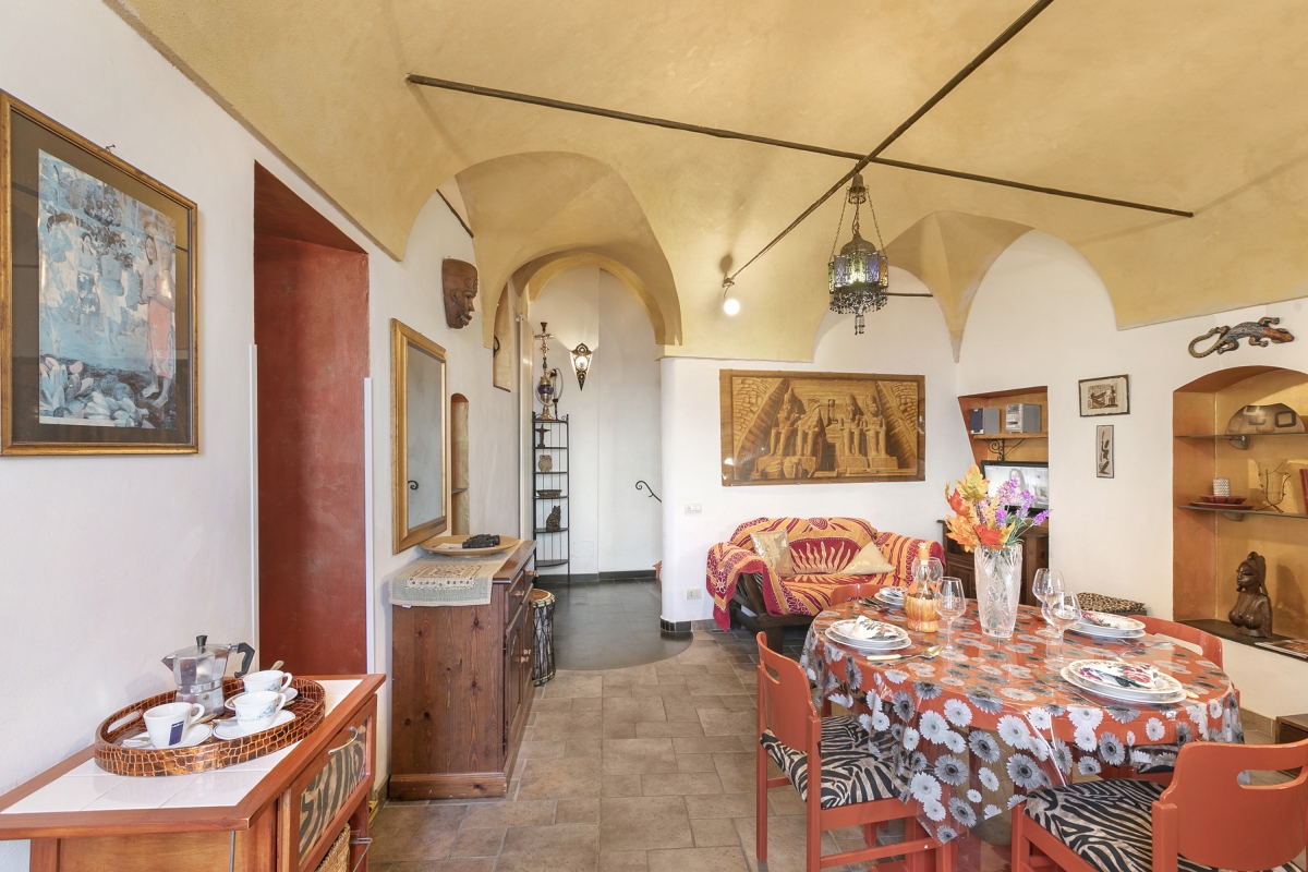 Located near the town center, this apartment is nestled in the quiet neighbourhood of Sanremo. A two-bedroom apartment on the third floor, it can comfortably host up to 4 guests. Upon entering, you will find a simple living room designed with medieval-style cave shelves and furnished with a sofa, a chest of drawers, a showcase and an inviting dining table set.