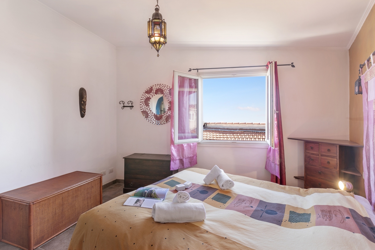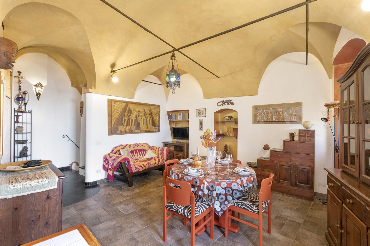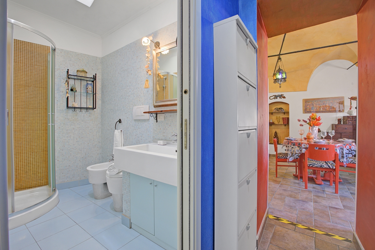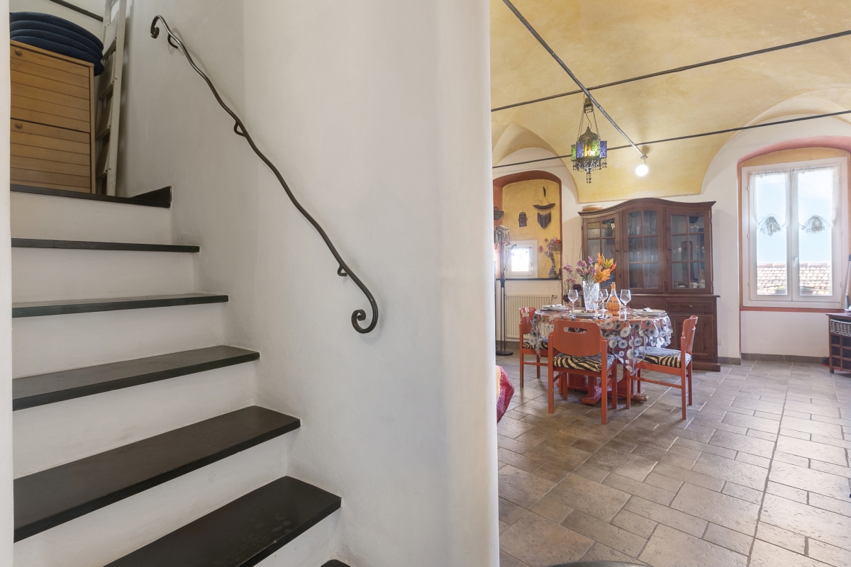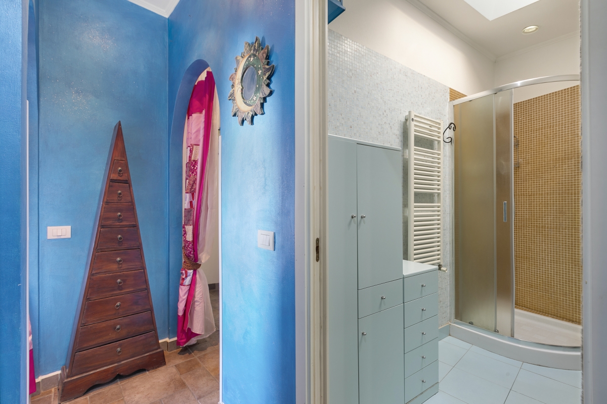 Located near the town center, this apartment is nestled in the quiet neighbourhood of Sanremo. A two-bedroom apartment on the third floor, it can comfortably host up to 4 guests. Upon entering, you will find a simple living room designed with medieval-style cave shelves and furnished with a sofa, a chest of drawers, a showcase and an inviting dining table set.