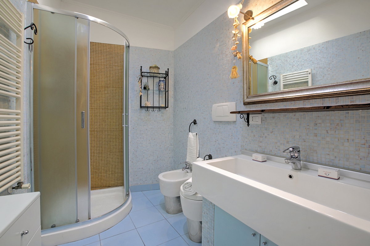 Bathroom 1: A private bathroom equipped with a shower, a bidet, a WC and a basin with a mirror.