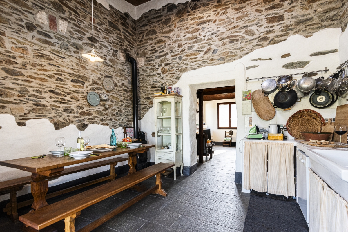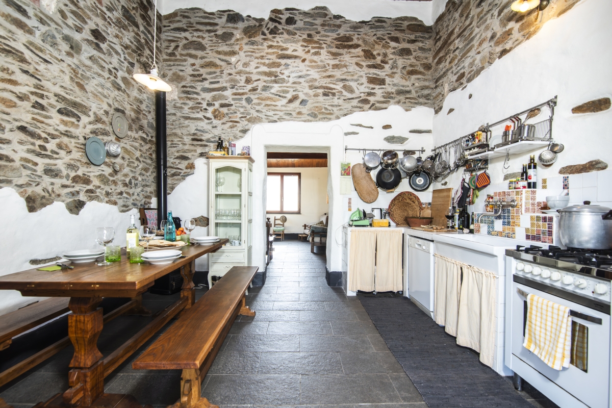The spacious interior is arranged over two floors and features exposed stone details on the walls and wood-beamed ceilings, there’s also a shady terrace that’s perfect for alfresco dining.